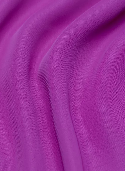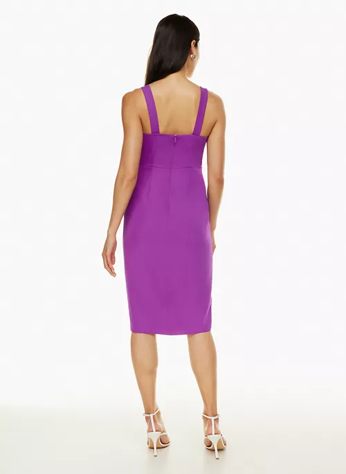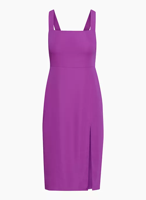 This is a sleeveless midi dress with a thigh slit and square neckline. It’s made with stretchy, drapey satin with a matte finish.