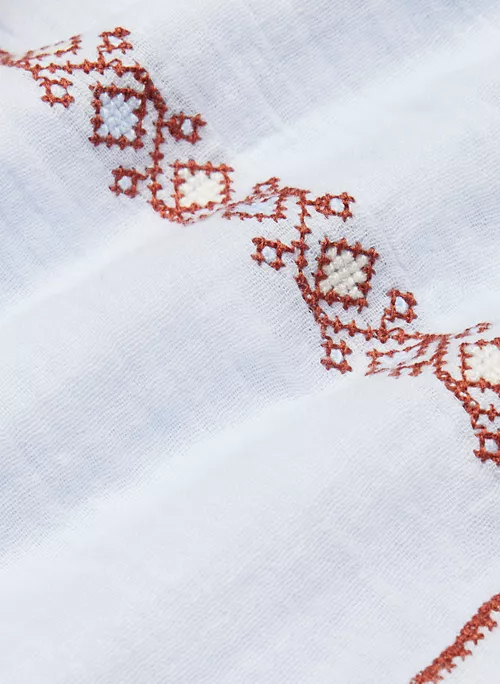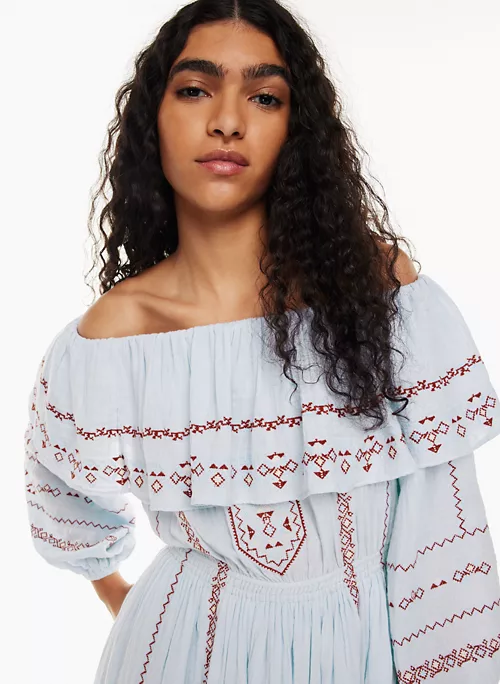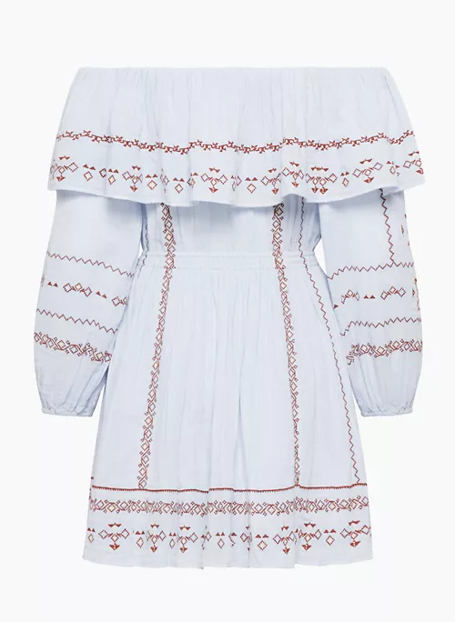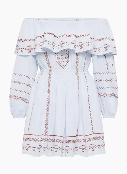 This is an off-the-shoulder mini dress with long sleeves and embroidered detailing throughout. It’s made with lightweight, gauzy cotton fabric.