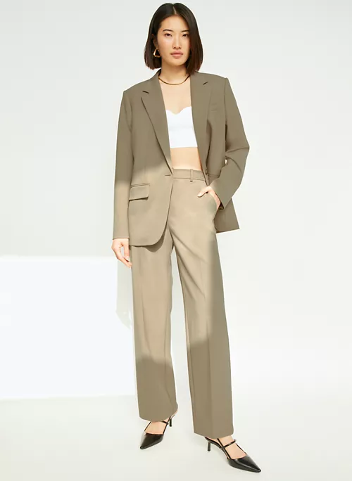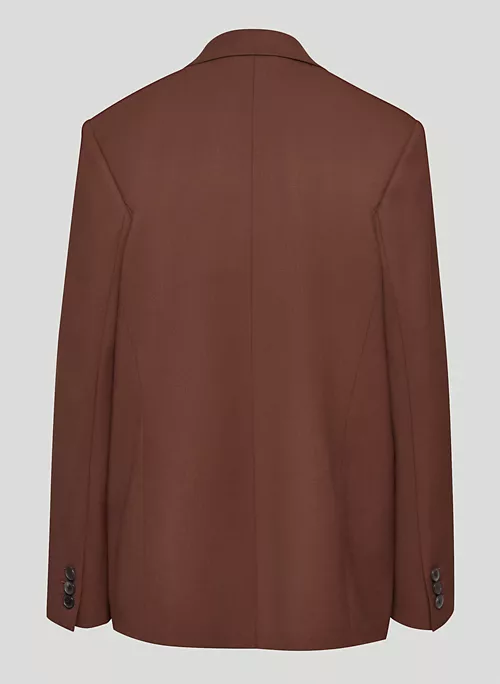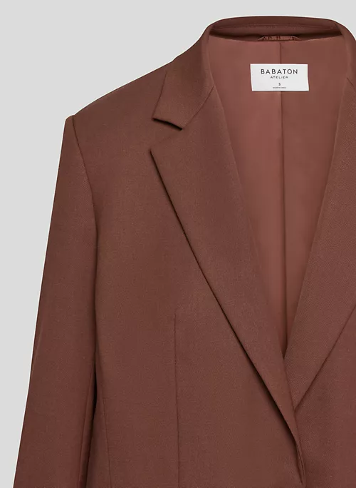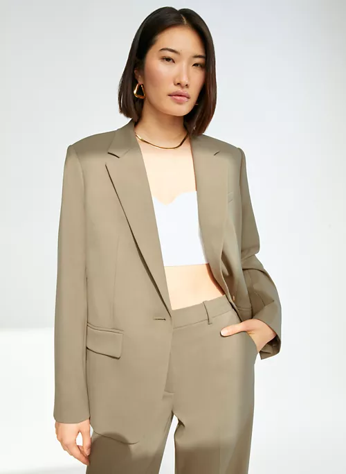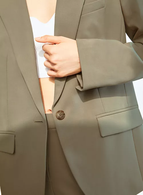 This is a relaxed single-breasted blazer with a notched lapel and darts for shaping. It’s made with responsibly sourced wool from a premier Italian mill.