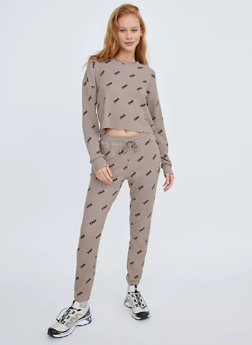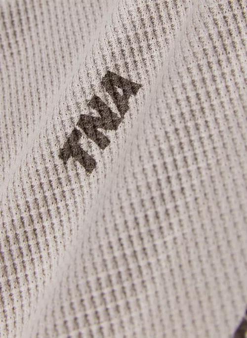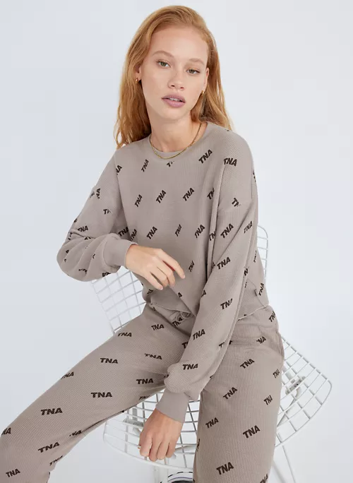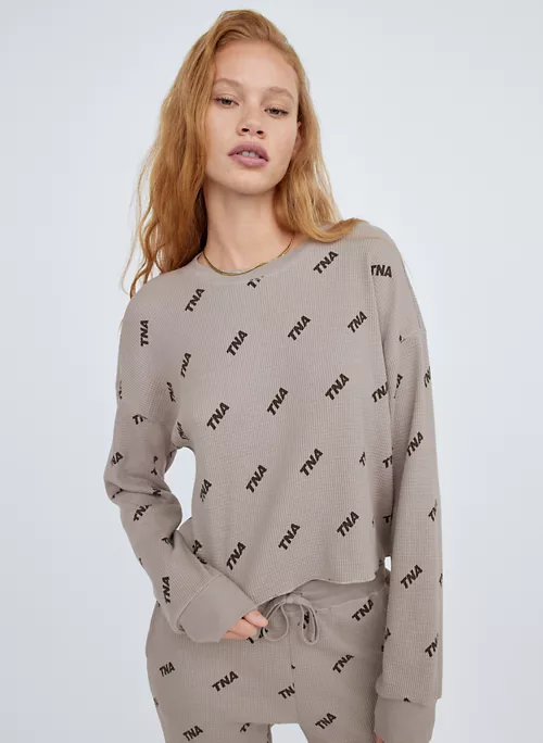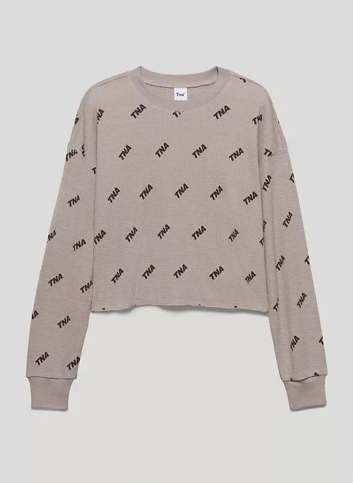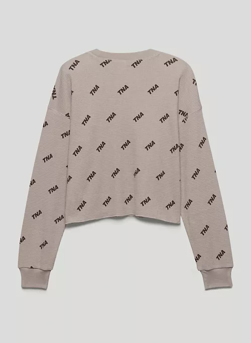 This is a crew-neck thermal longsleeve with a boxy fit and a raw hem. It’s made with cozy waffle-knit fabric. This version comes in a branded graphic print that’s exclusive to the brand.