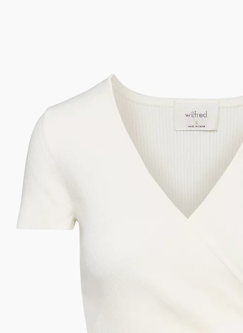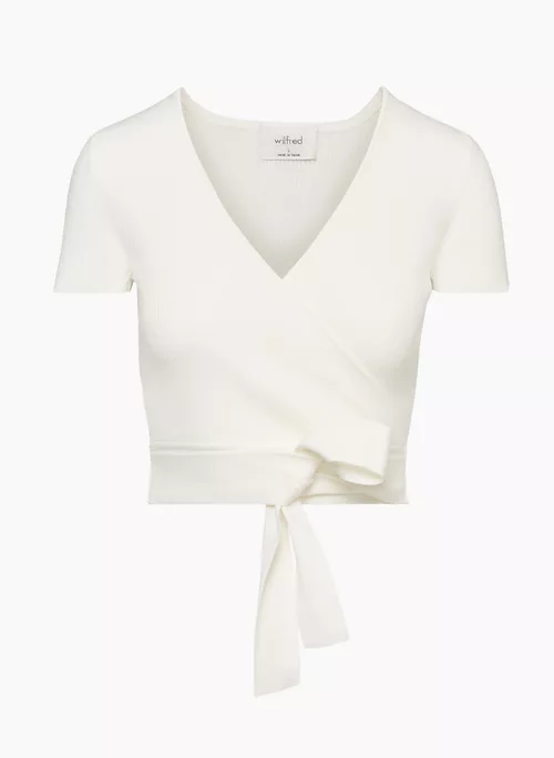 This is a short-sleeve wrap sweater with a tie at the waist. It’s rib-knit with soft, spongey, all-season yarn made with LENZING™ ECOVERO™ Viscose — responsibly sourced wood-based fibres produced through a process that reduces impact on forests, biodiversity and water supply.