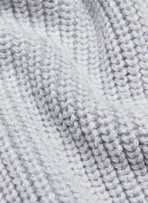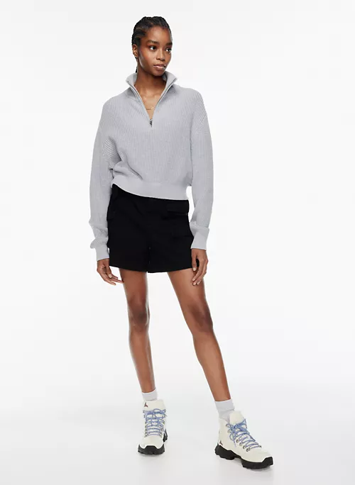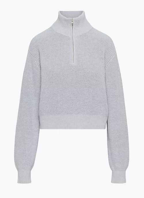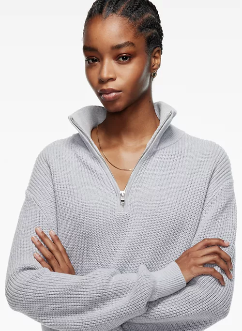 This is a mock-neck, 1/4-zip sweater with dropped shoulders and ribbed trim. It’s knit using a fisherman stitch with soft cotton yarn.Ā