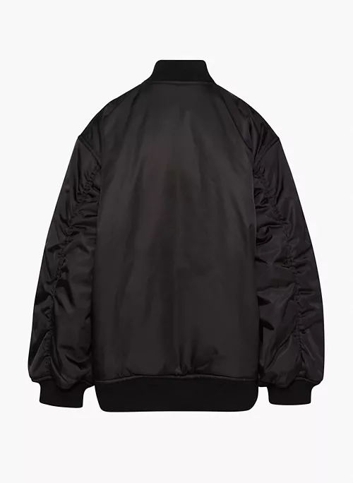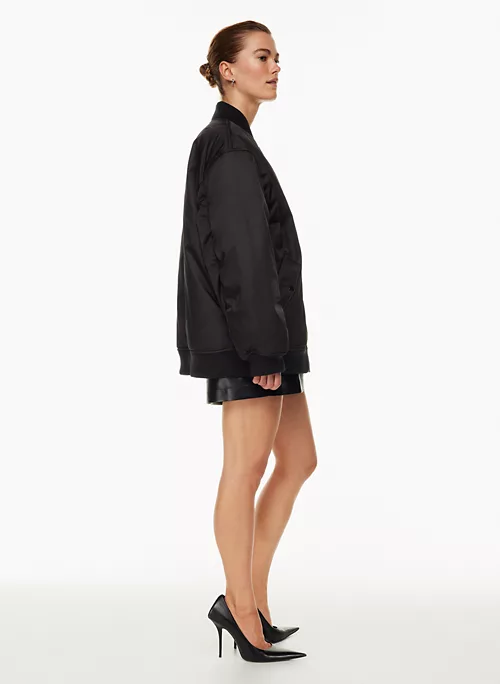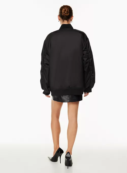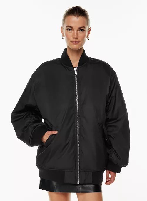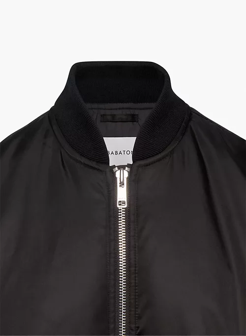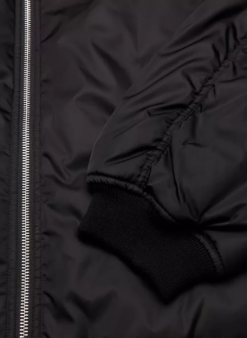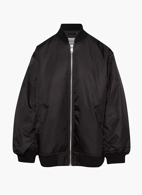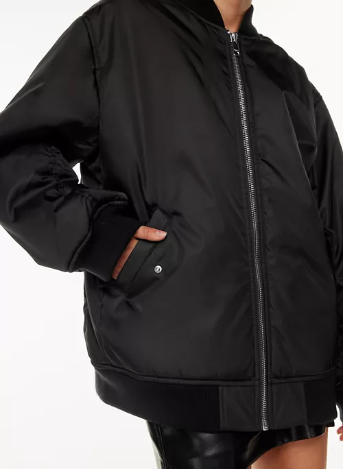 This is an oversized bomber jacket with a ribbed trim. It’s made with (RE)Nylo Tech — water-repellent twill fabric from Italy with a glossy finish and a slick feel. It’s made with 100% ECONYL® regenerated nylon. It’s filled with PrimaLoft® Black Insulation — the world’s best down alternative, made with recycled materials.