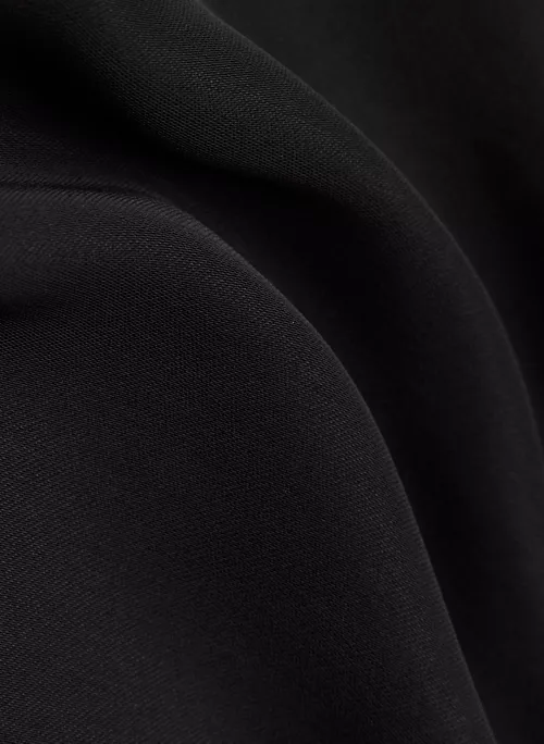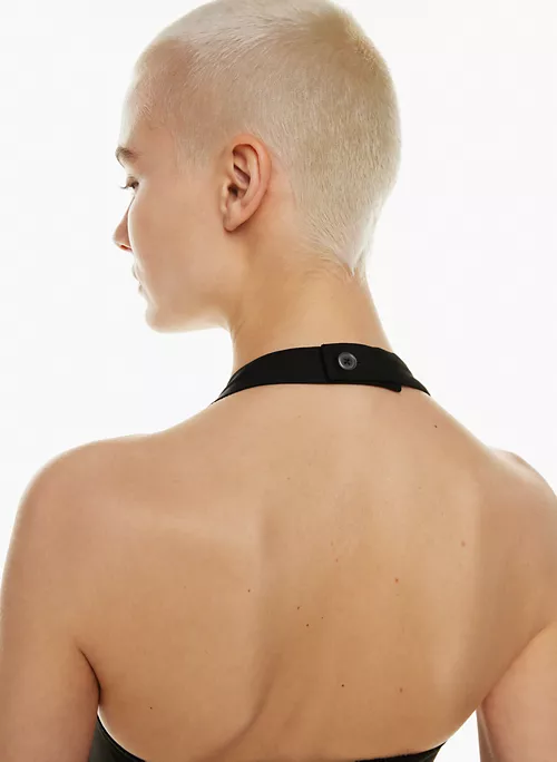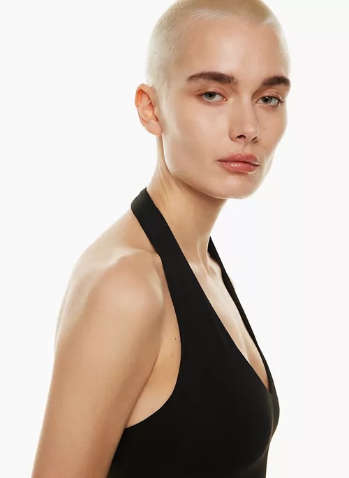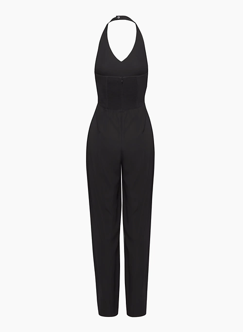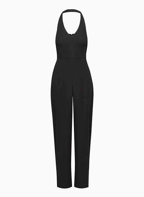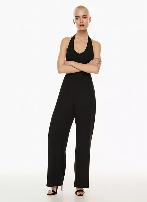 This is a full-length, straight-leg jumpsuit with a halter neckline and smocked back. It’s made with stretchy, drapey matte satin.