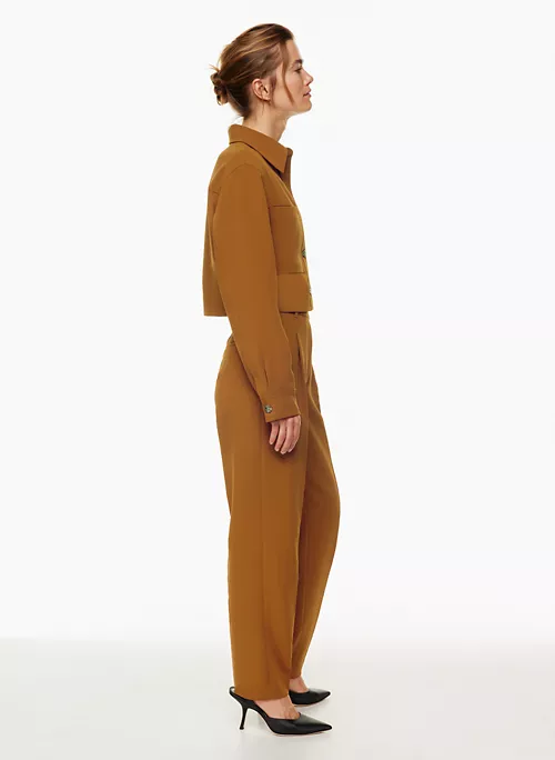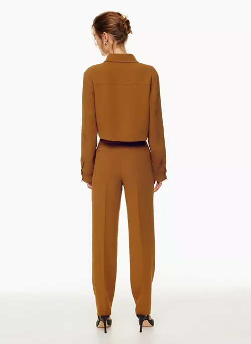 These are high-waisted pleated pants with front hand pockets and back welt pockets. They’re cut from Crepette — Wilfred’s iconic crepe fabric famous for its subtle texture and breezy, effortless drape. It’s sourced from a premier Japanese mill.