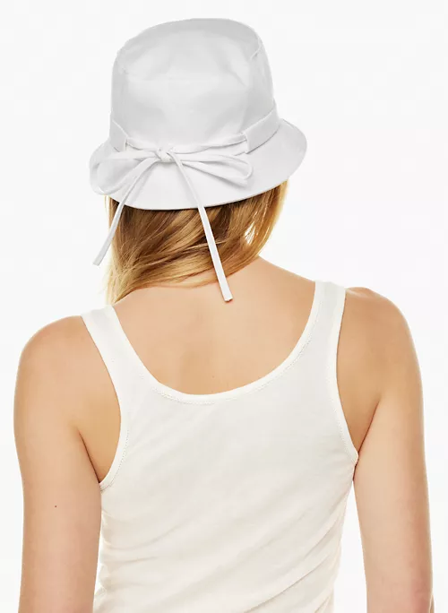 This is a drawcord bucket hat with an interior sweatband and adjustable ties. It’s crafted from 100% cotton twill.