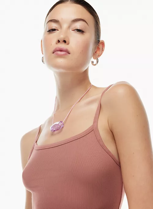 This is a scoop-neck tank with spaghetti straps. It’s made with ReRIB, a soft and drapey ribbed fabric that uses TENCEL™ Modal — responsibly sourced wood-based fibres produced through a process that reduces impact on forests, biodiversity and water supply.