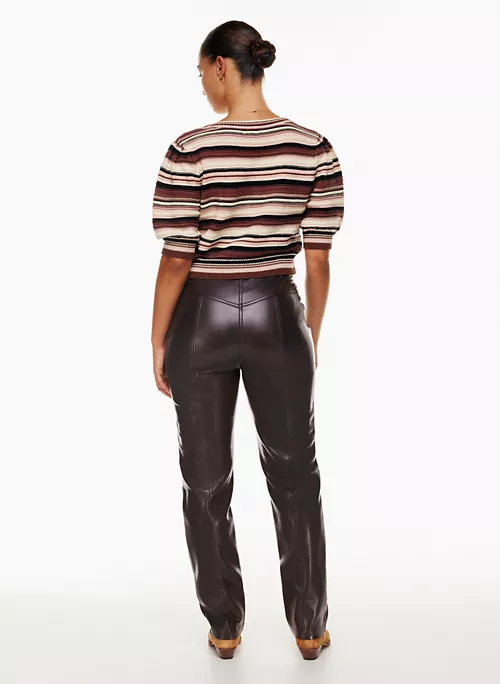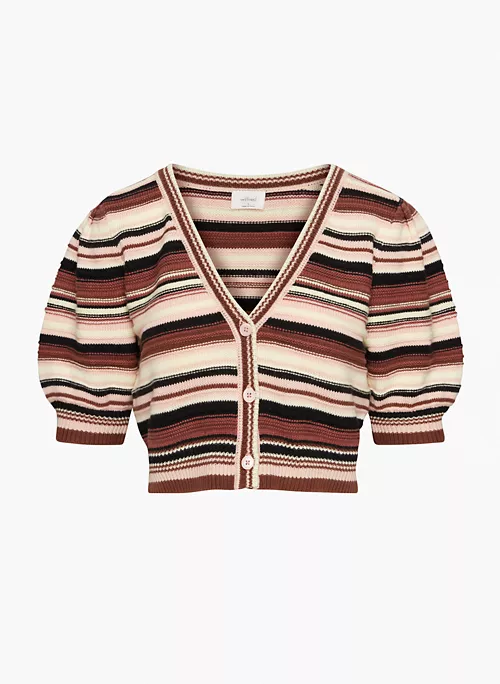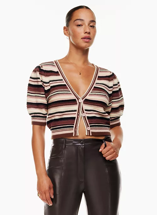 This is a V-neck cardigan with a front button placket and short puff sleeves. It’s knit with an extra-fine merino wool-cotton blend that’s lightweight and super soft against your skin. This version comes in an earthy stripe pattern.