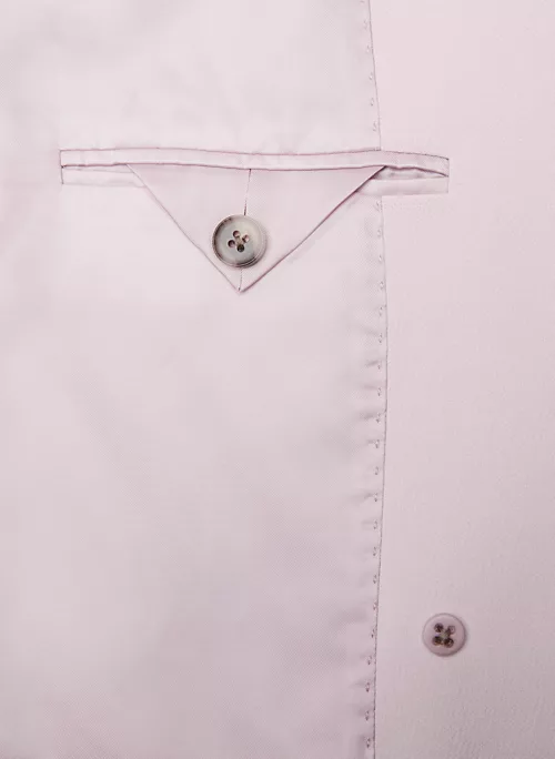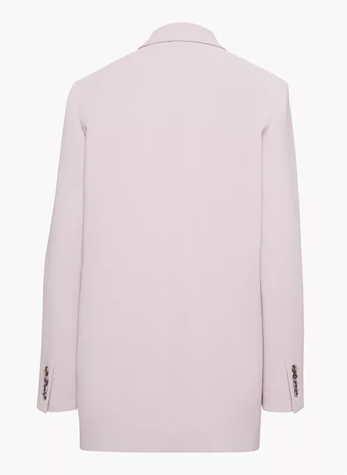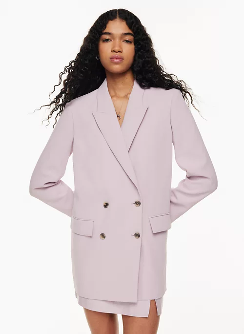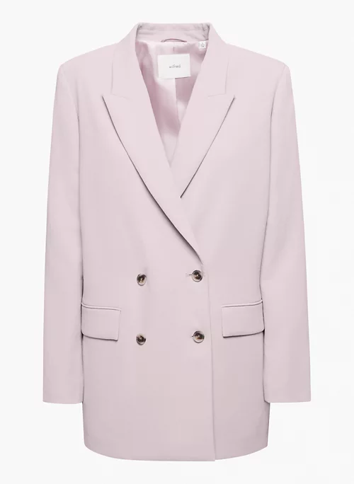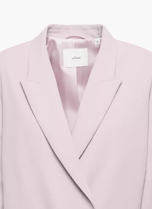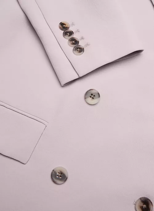 This is a fully lined, double-breasted blazer with a peaked lapel and a button-closure interior welt pocket. It’s made from Crepette™ — Wilfred’s iconic crepe fabric famous for its subtle texture and breezy, effortless drape. It’s sourced from an innovative Japanese mill.