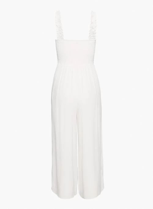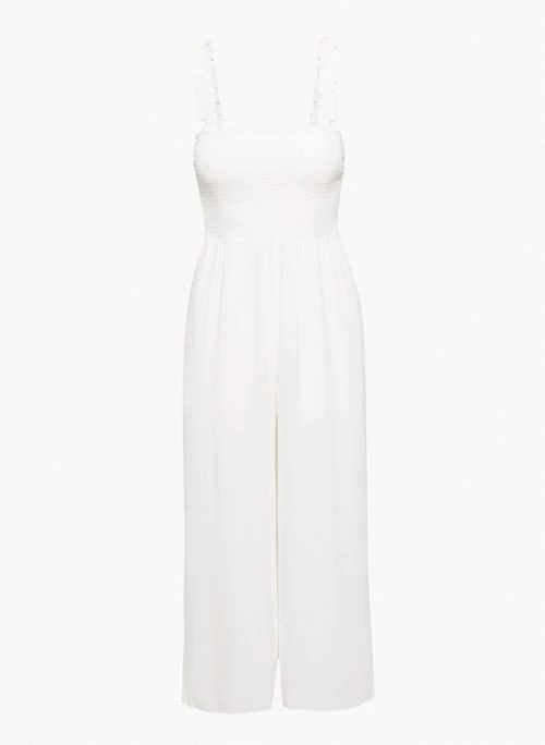 This is a smocked, wide-leg jumpsuit with inseam pockets. It’s made with lightweight, drapey pebbled crepe fabric.