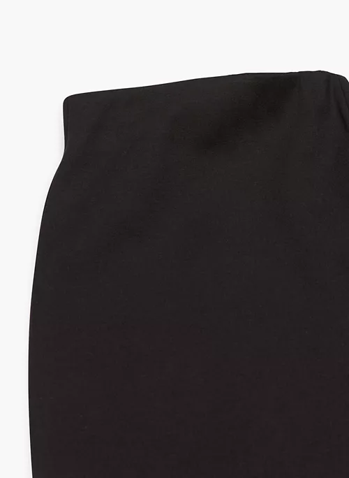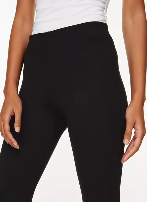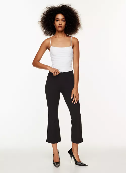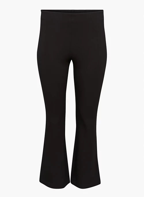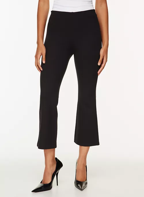 These are high-waisted kick-flare pants with a slim leg and an elastic waistband for easy wear. They’re made with a gutsy ponte fabric from Italy that holds you in.