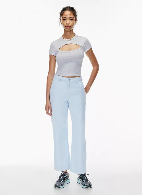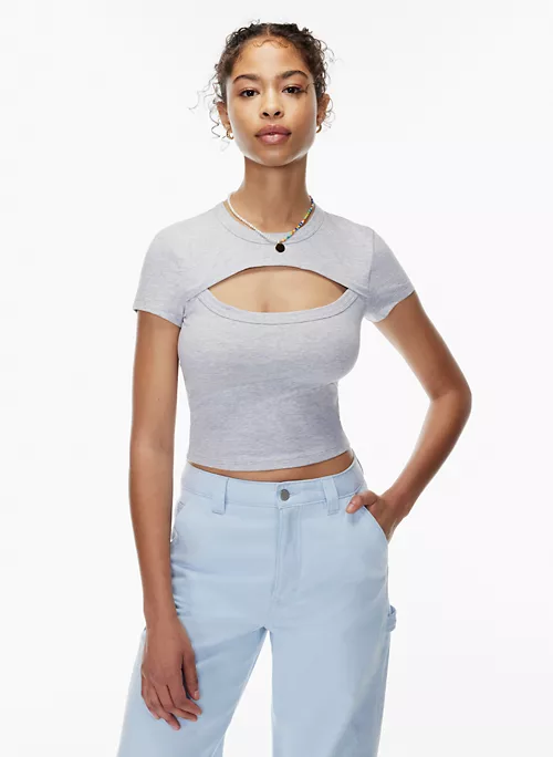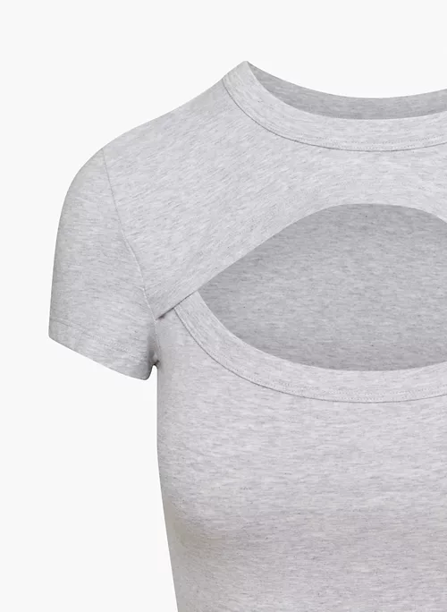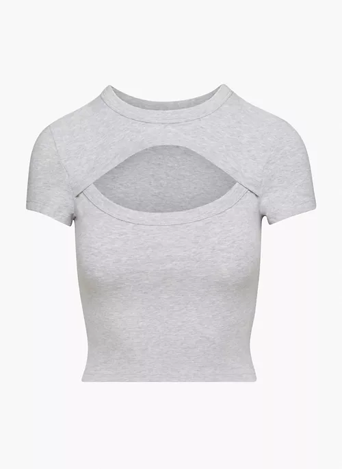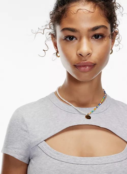 This is a crew-neck t-shirt with a cutout detail. It’s made with TnaCHILL⢠ā cotton soft, wear-everyday stretch jersey that feels great against your skin.