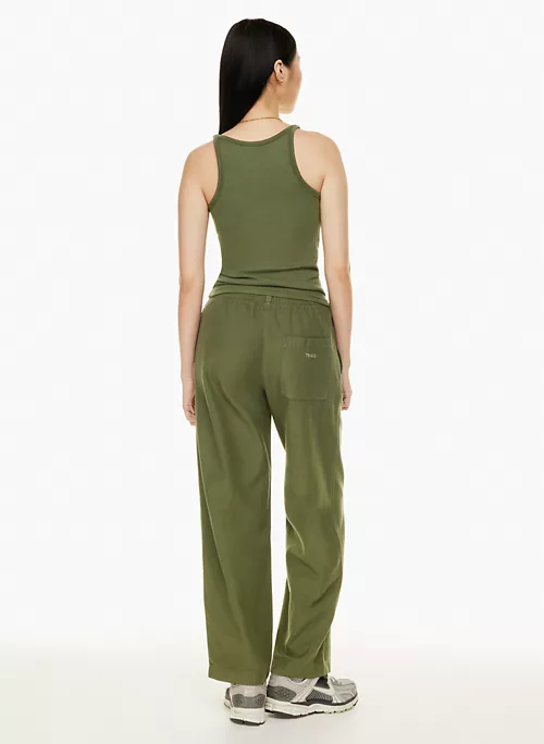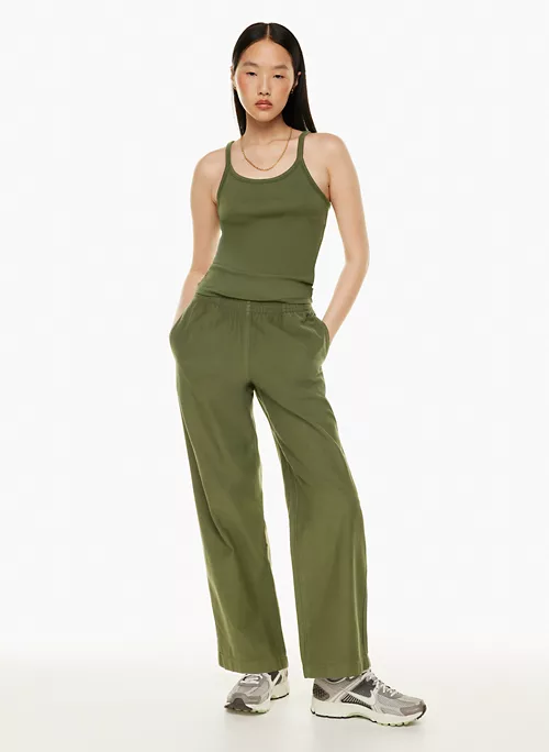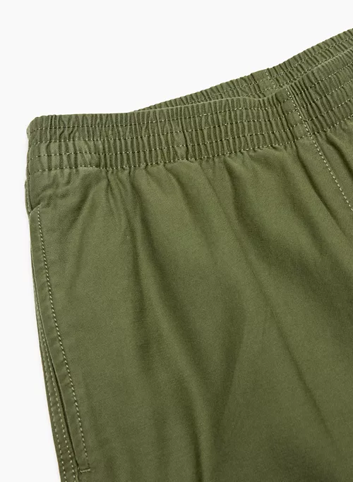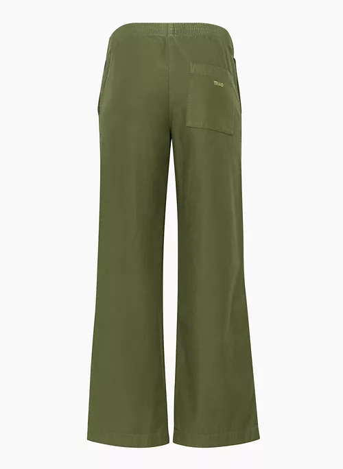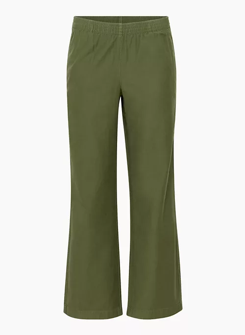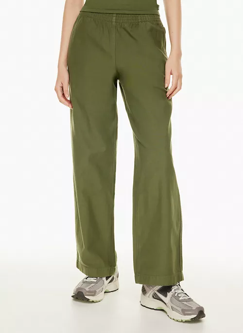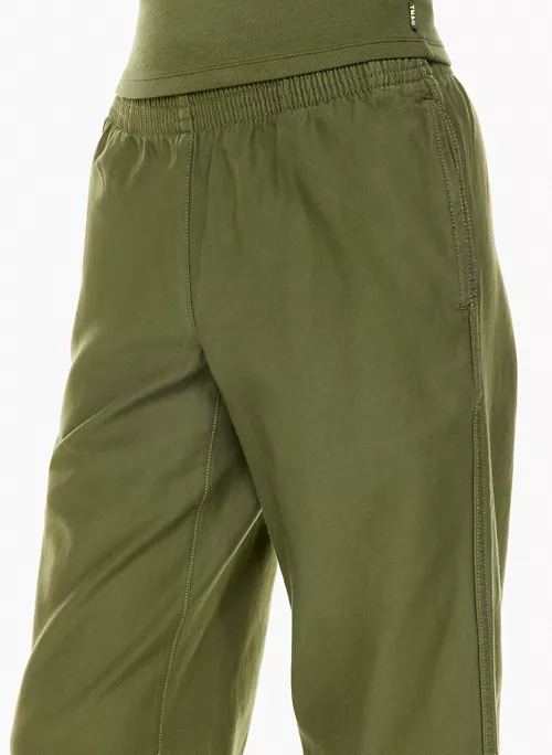 These are mid-rise pants with an elastic waist and inseam pockets. They’re made from canvas-like cotton twill with a subtle sheen.