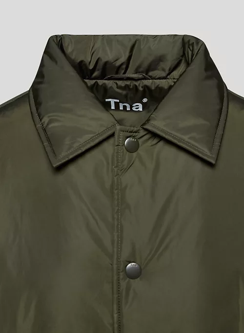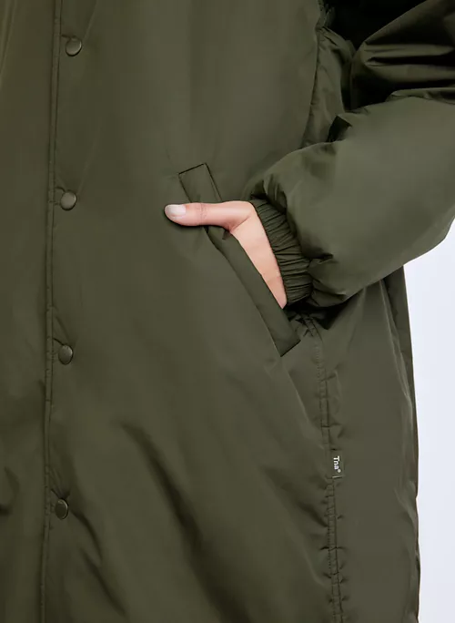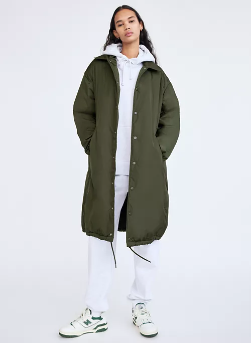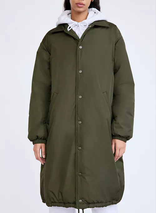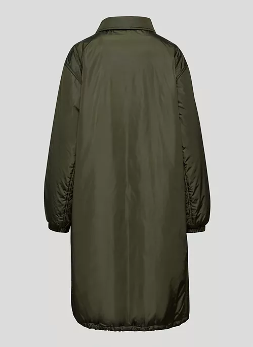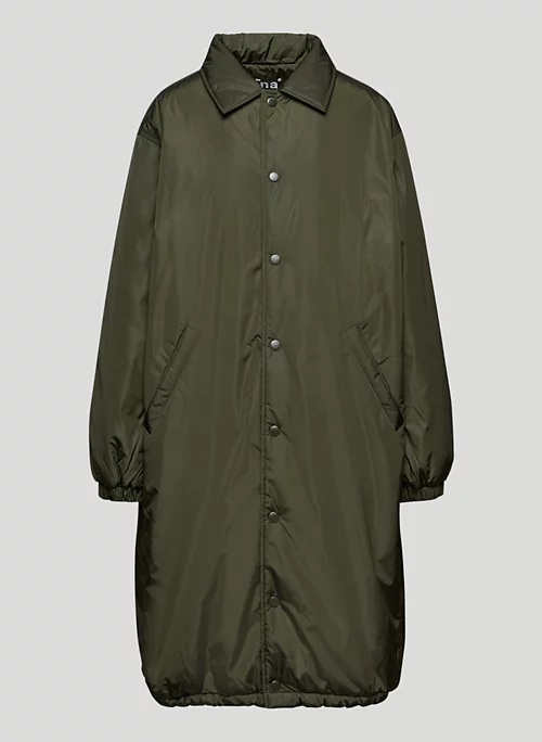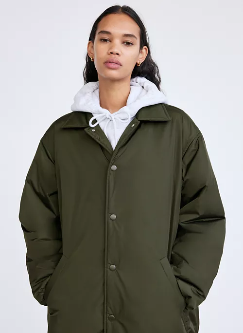 Engineered to deliver warmth to -20°C / -4°F, this is an extra-oversized, snap-front jacket with a pointed collar and a cinchable shockcord hem. It’s constructed with Nylo Tech, a technical, water-repellent fabric. This version is from Italy, is wind resistant and is made with 100% ECONYL® — regenerated nylon with a soft feel.