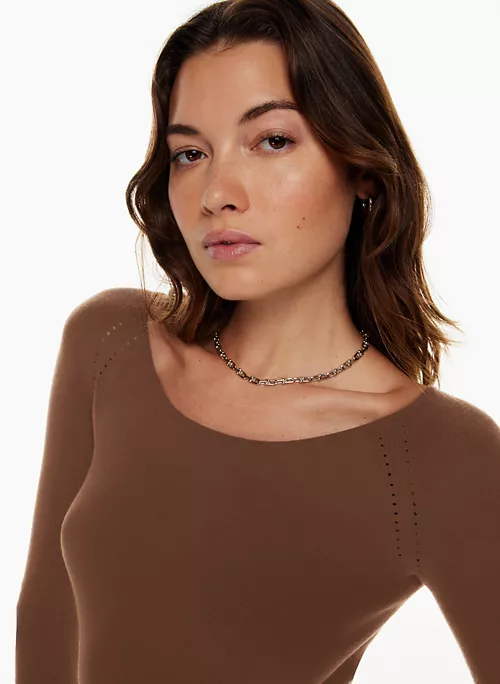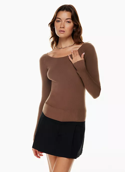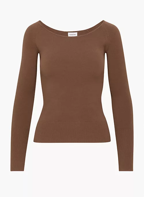 This is a ballet-inspired sweater with a boat neckline and fully fashioned construction. It’s knit with Wonder Yarn — the lightweight yarn that lives up to its name. This peachy-soft yarn offers the all-season warmth of wool, without the wool. It’s made with LENZING™ ECOVERO™ Viscose — responsibly sourced wood-based fibres produced through a process that reduces impact on forests, biodiversity and water supply. This version is constructed using a Double Knit stitch for structure and a flat, dense feel.