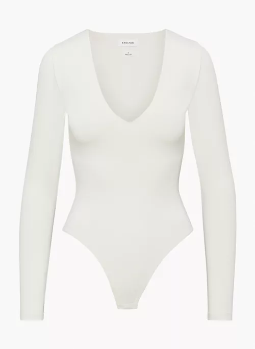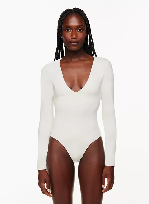 This is a deep V-neck bodysuit with long sleeves. It’s made with Babaton’s signature Contour ā luxe, ultra-flattering fabric coveted for its smoothing effect and second-skin feel. Essential for every body.