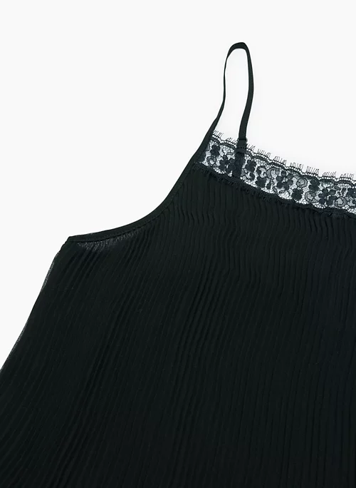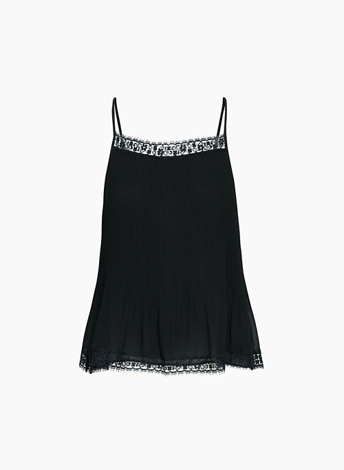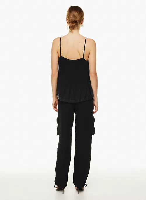 This is a lined cami blouse with a lace trim and adjustable straps. It’s cut from Fête Chiffon — lightweight, semi-sheer fabric with an ethereal drape that’s made from 100% recycled materials.