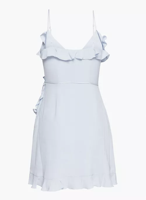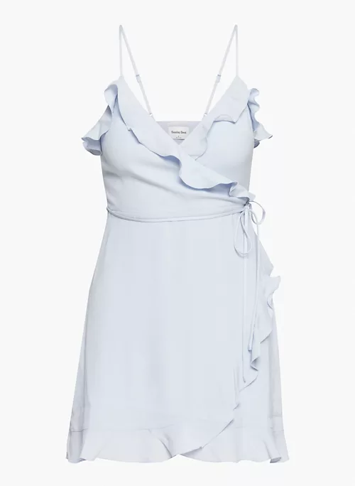 This is a mini wrap dress with a V neckline, adjustable straps and a ruffled trim. It’s made from lightweight, drapey crepe fabric.