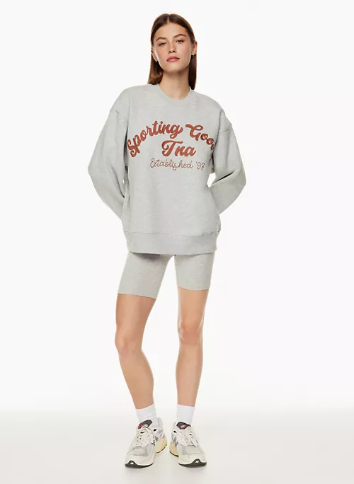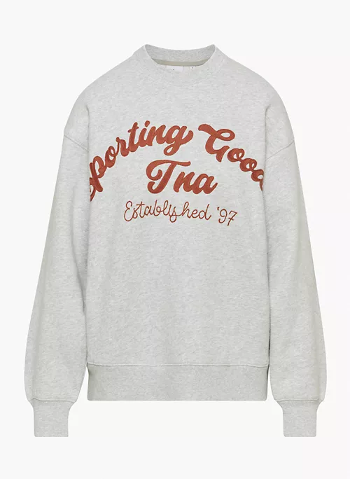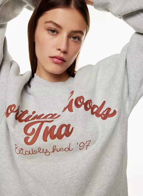 This is a crew-neck sweater with dropped shoulders. It’s made with Tna’s Cozy Fleece — premium, midweight fleece famous for its soft-brushed back, sueded face and cloud-nine cozy feel. The world’s best. Its fit has been perfected season after season for the ultimate relaxed look. This version features an exclusive text graphic that was designed in-house.