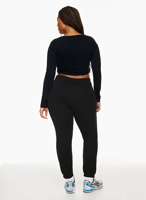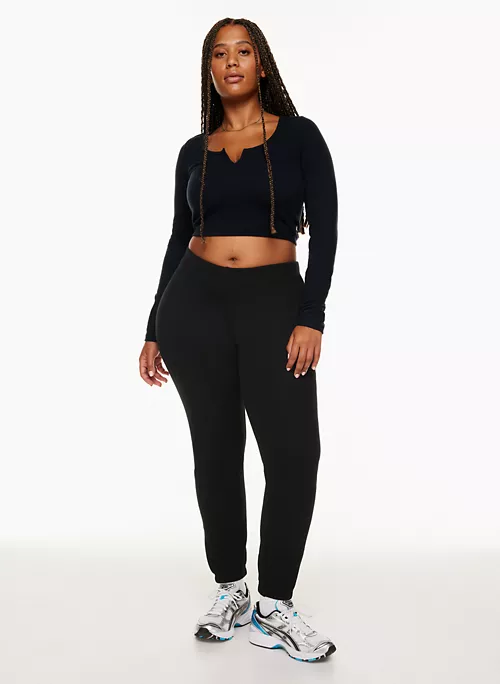 These are high-rise sweatpants with a slim leg and elastic cuffs. They’re made with Tnaās Cozy Fleece ā premium, midweight fleece famous for its soft-brushed back, sueded face and cloud-nine cozy feel. The world’s best.
