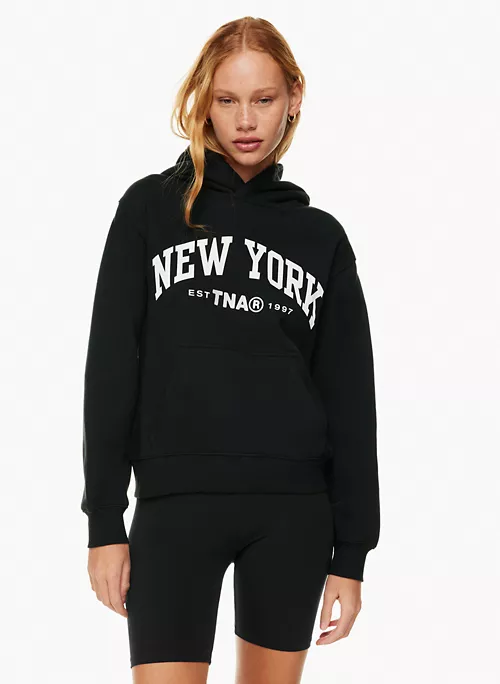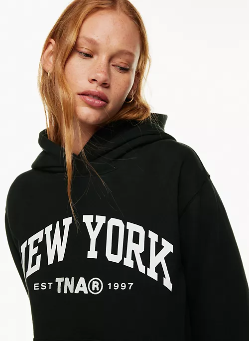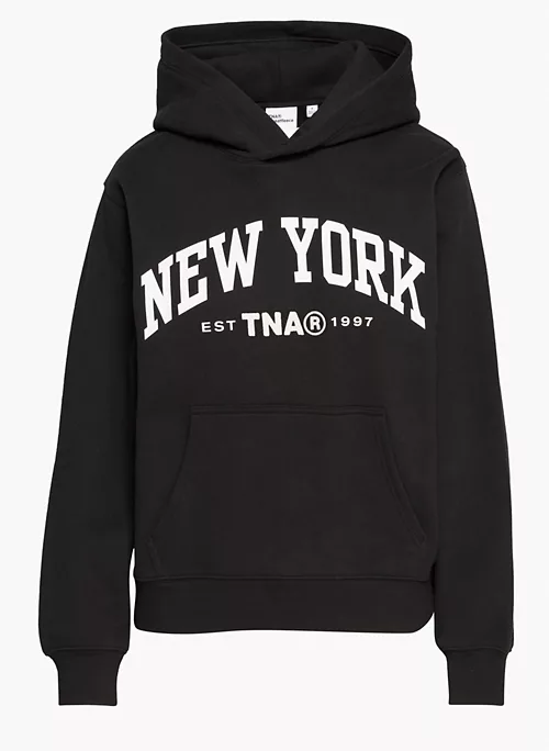 This is a hooded pullover with a kanga pocket. Itās made with Tnaās Cozy Fleece ā premium, midweight fleece famous for its soft-brushed back, sueded face and cloud-nine cozy feel. The worldās best. This version features an exclusive New York graphic that was designed in-house.