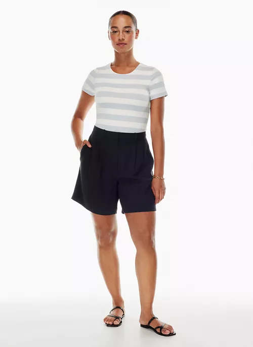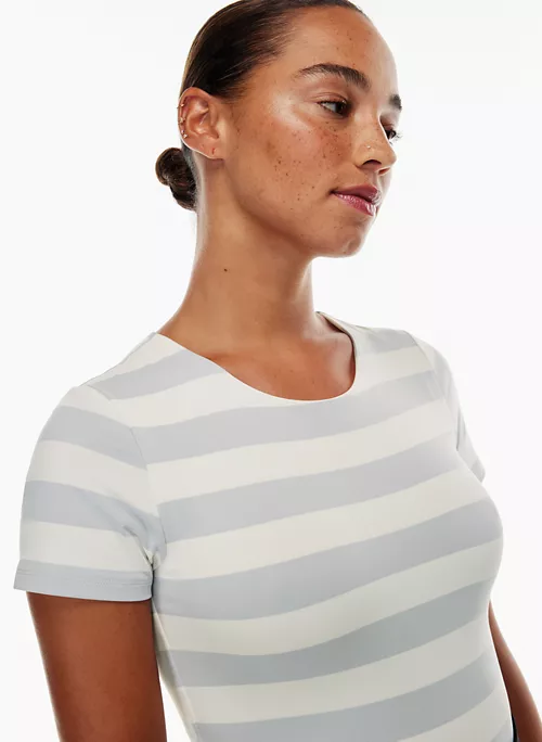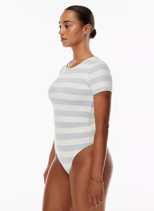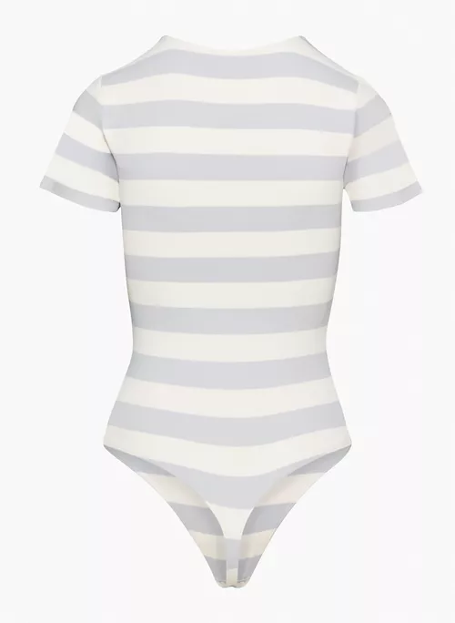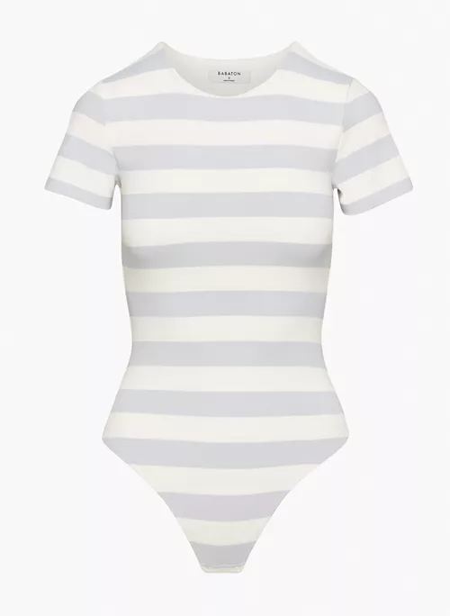 This is a short-sleeve, crew-neck bodysuit with doubled body fabric that shapes and supports. Itâs made with Contour â a luxe, high-stretch fabric with a second-skin feel. This version features a yarn-dyed stripe pattern.Â
