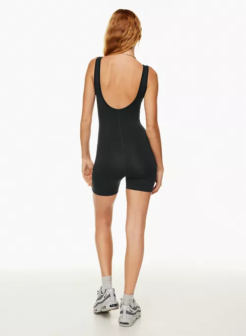 This is a V-neck romper with a scoop back. It’s made with a soft, sleek, gutsy fabric that holds you in.Ā