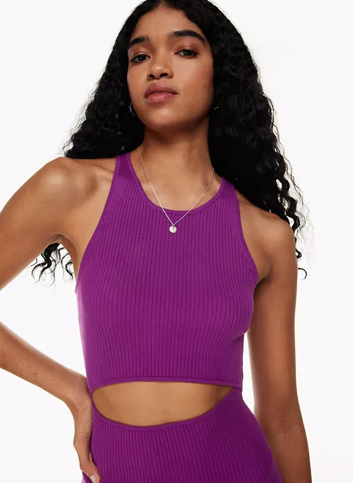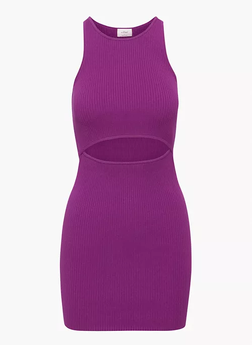 This is a mini tank sweater dress with a waist cut-out and fully fashioned construction. It’s made with Wonder Yarn — the lightweight yarn that lives up to its name. This peachy-soft yarn offers the all-season warmth of wool, without the wool. It’s made with LENZING™ ECOVERO™ Viscose — responsibly sourced wood-based fibres produced through a process that reduces impact on forests, biodiversity and water supply. This version is constructed using a Wide Rib stitch with distinct columns for comfortable widthwise stretch.