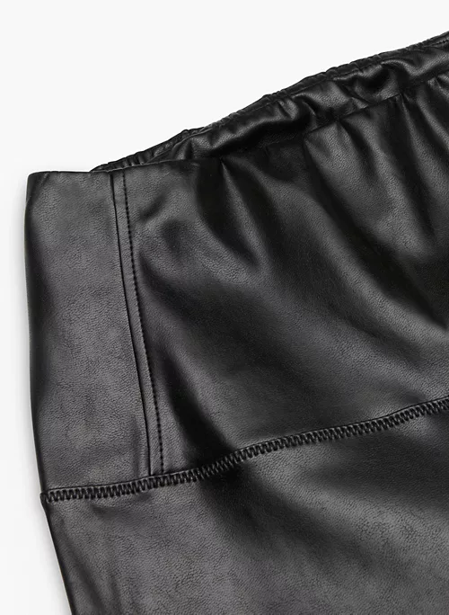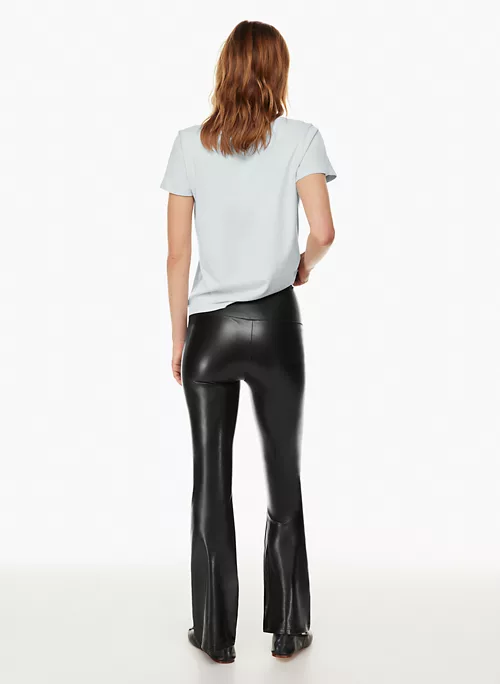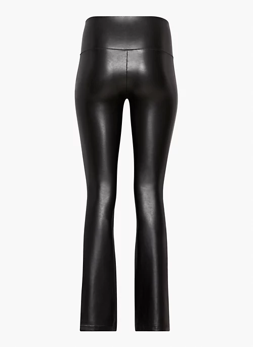 These are high-rise flared leggings with a wide waistband for a smooth silhouette. They’re made with our premium Stretch Vegan Leather from Japan, crafted for superior shape retention, easy care and an authentic look and feel.