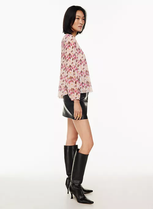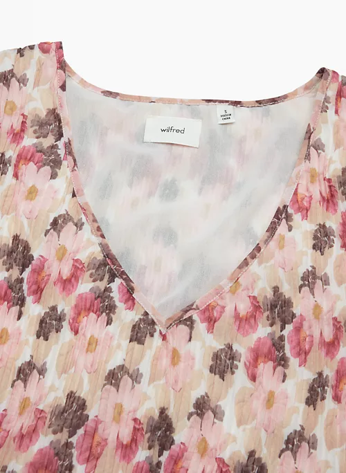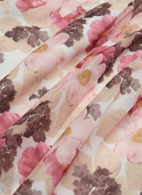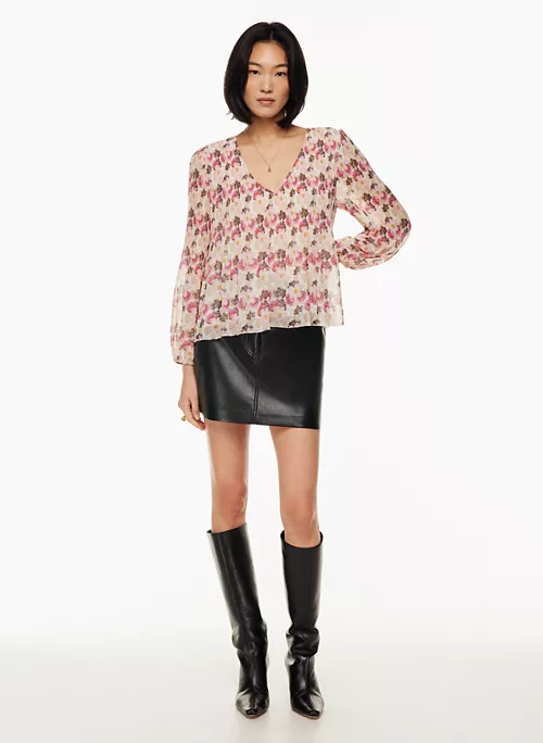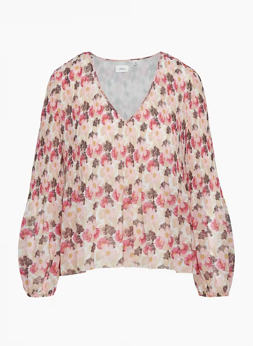 This is a long-sleeve V-neck trapeze blouse with accordion pleats throughout. Itβs made from FΓͺte Chiffon β lightweight, semi-sheer fabric with an ethereal drape. This version comes in an exclusive floral print that was designed in-house.