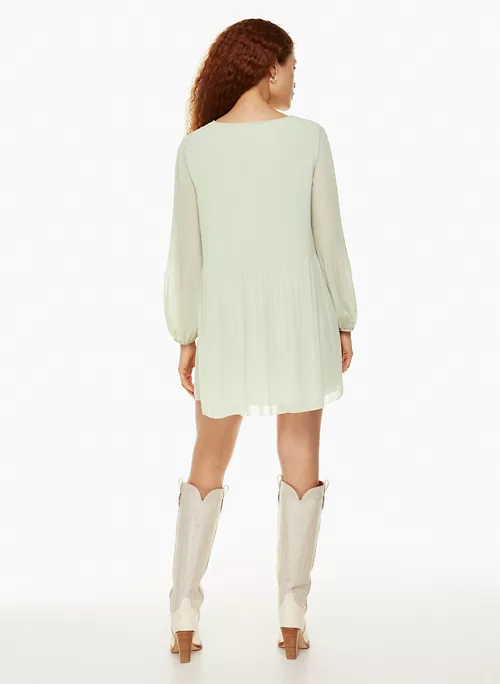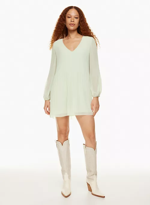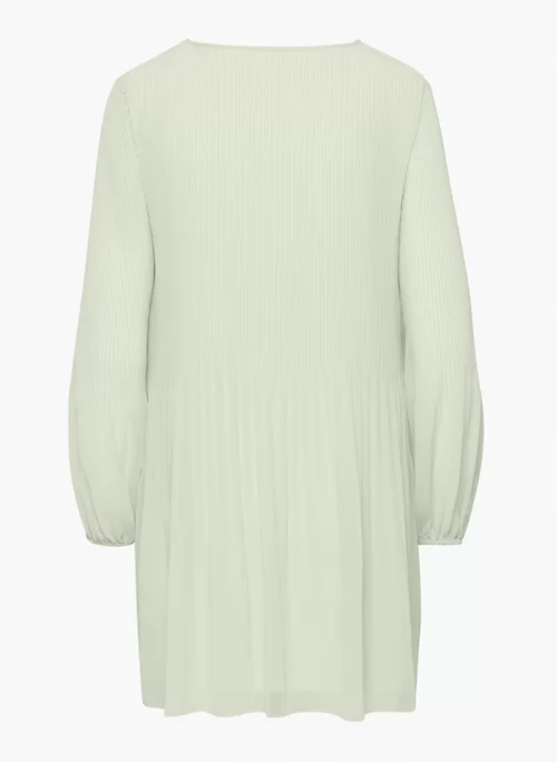 This is a V-neck dress with long sheer sleeves and accordion pleats throughout. It’s cut from FĆŖte Chiffon ā lightweight, semi-sheer fabric with an ethereal drape thatās made from 100% recycled materials.