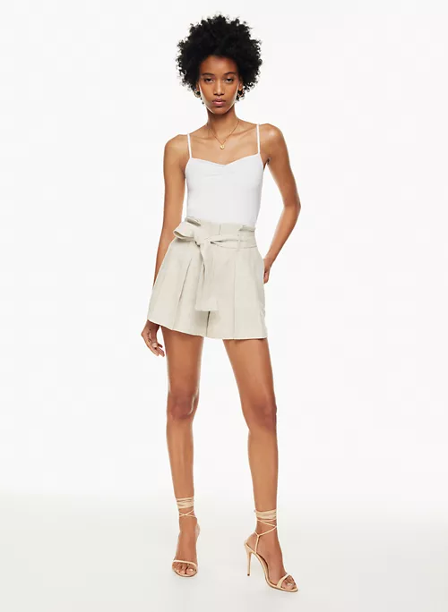 These are high-rise belted shorts with inseam pockets. They’re tailored with drapey linen and TENCEL⢠Lyocell ā responsibly sourced wood-based fibres produced through a closed-loop system that reduces environmental impact.