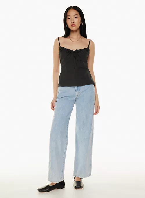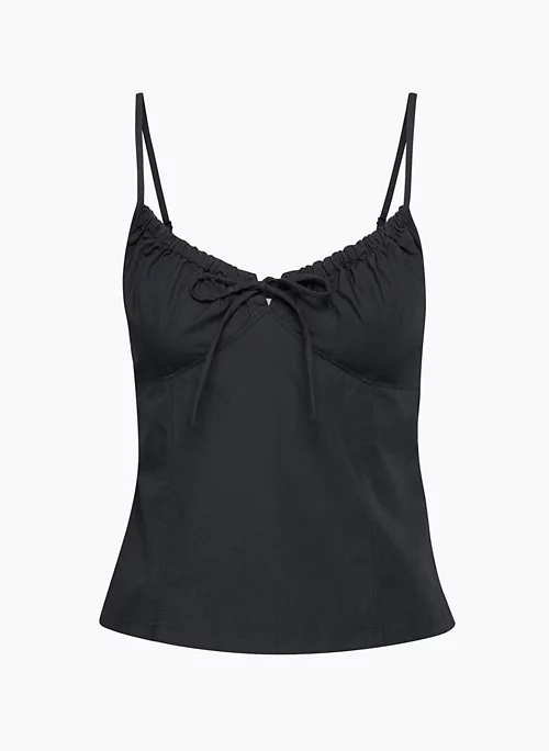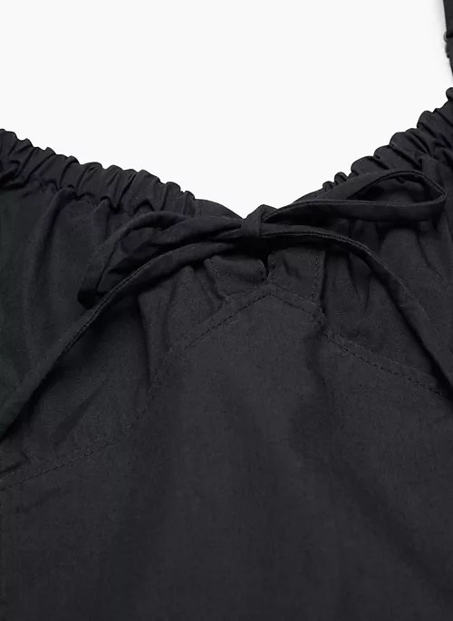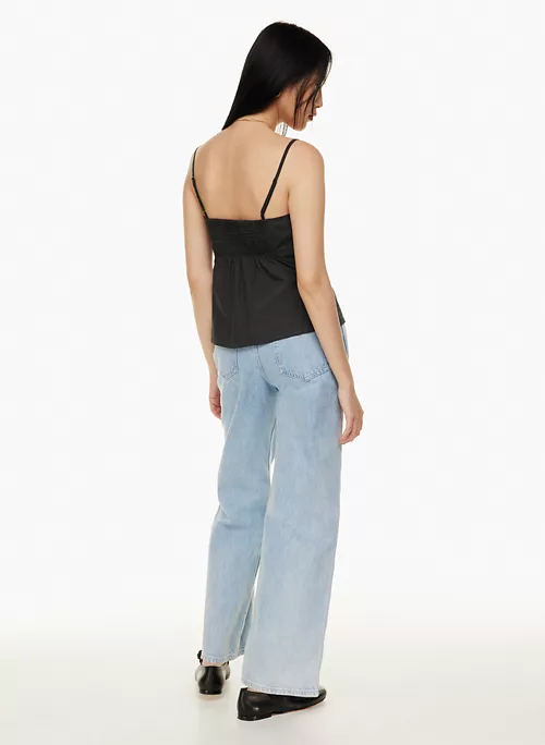 This is a smocked-back camisole with a centre tie detail and adjustable straps. It’s made from lightweight cotton poplin with a smooth, crisp feel.