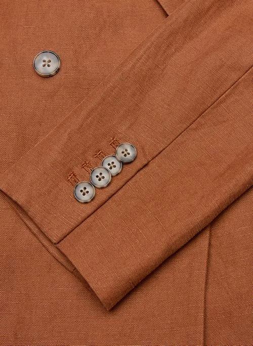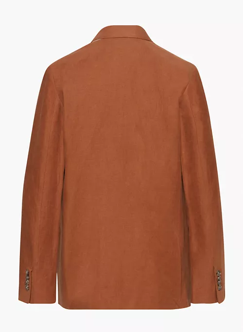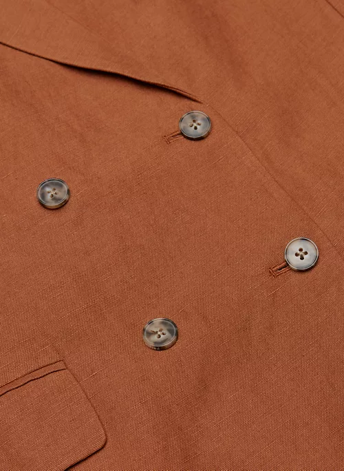 See attached. This is a double-breasted blazer with a peaked lapel, welt pockets and shoulder pads. It’s cut from soft, drapey fabric made with linen and TENCEL™ Lyocell — responsibly sourced wood-based fibres produced through a closed-loop system that reduces environmental impact.