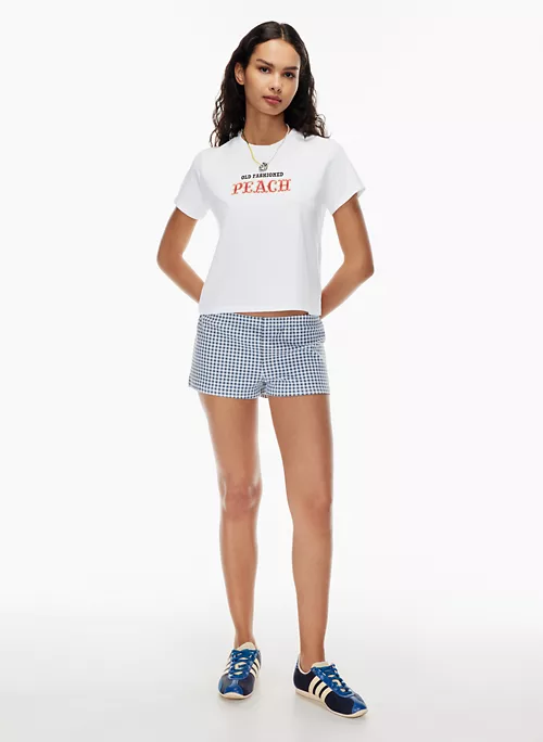 This is a crew-neck t-shirt. It’s made from soft combed cotton. This version features a peach graphic that’s exclusive to the brand.