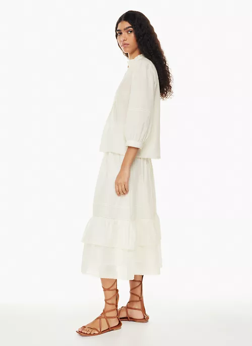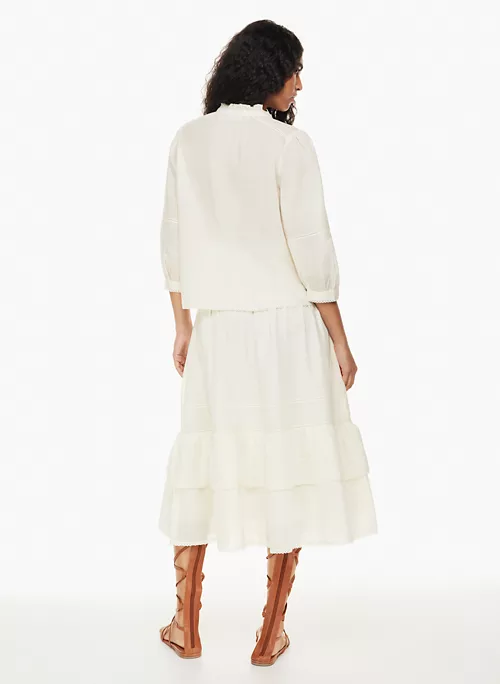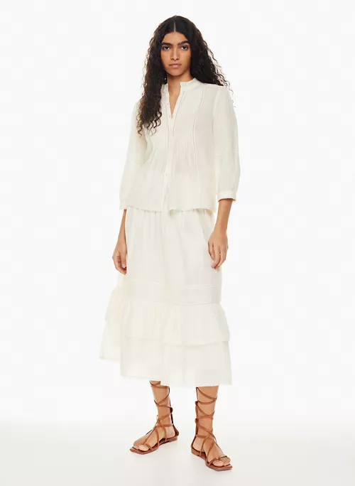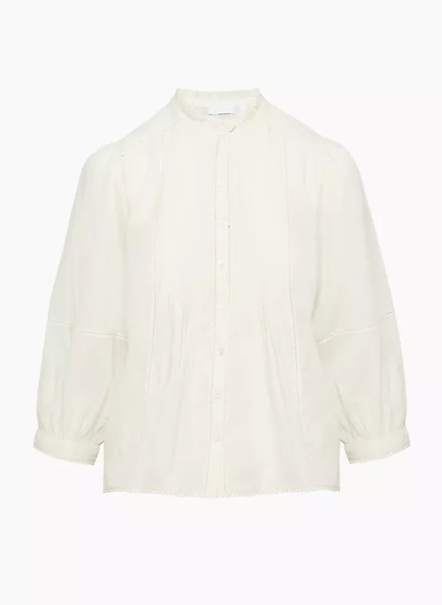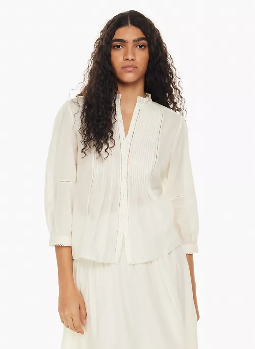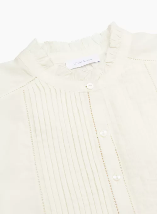 This is a collared button-up blouse with lace trim and pintuck detailing. It’s made from lightweight, soft 100% organic cotton.