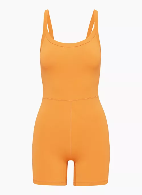 This is a scoop-neck romper. It’s made with versatile, body-hugging fabric that’s sweat wicking and cottony soft.