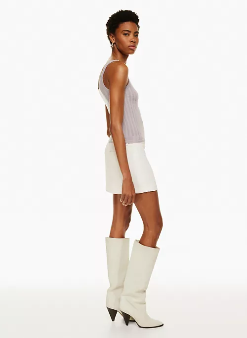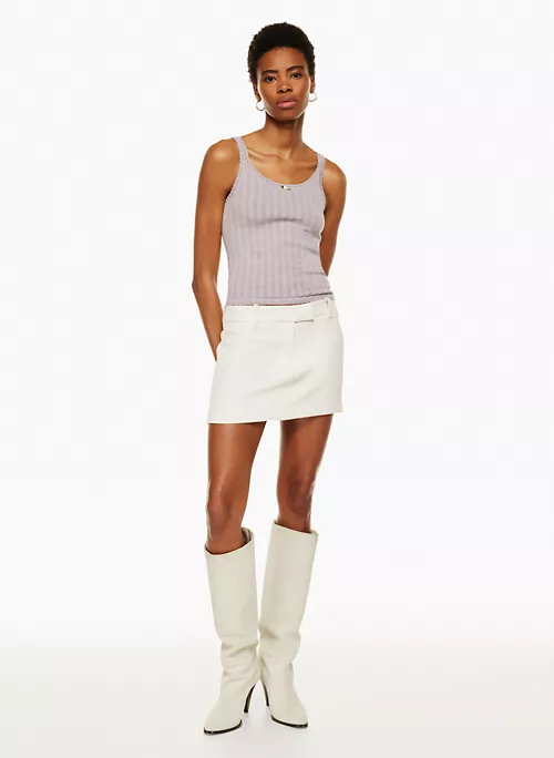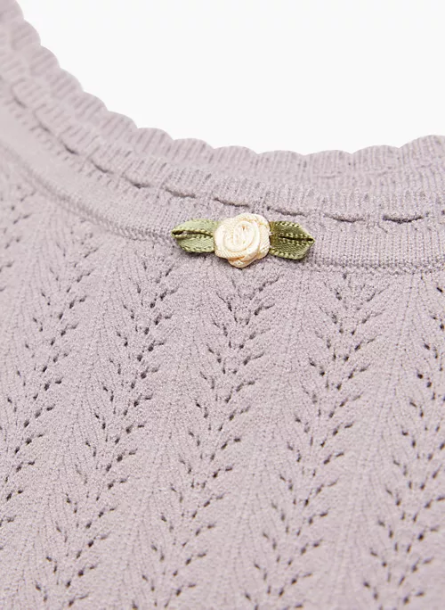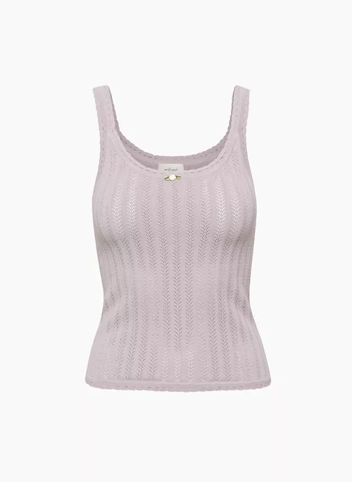 This is a fully fashioned scoop-neck tank with a rosette trim. It’s knit with Wonder Yarn — the lightweight yarn that lives up to its name. This peachy-soft yarn offers the all-season warmth of wool, without the wool. It’s made with LENZING™ ECOVERO™ Viscose — responsibly sourced wood-based fibres produced through a process that reduces impact on forests, biodiversity and water supply. This version is constructed using a Pointelle stitch for a delicate look and airy feel.