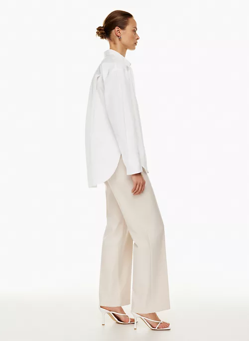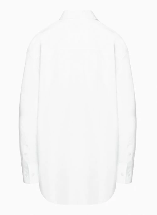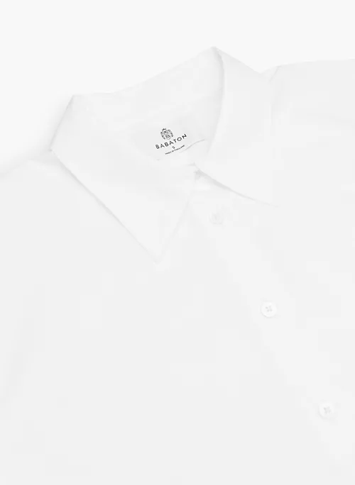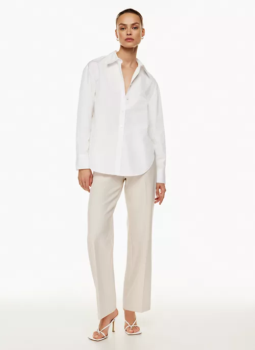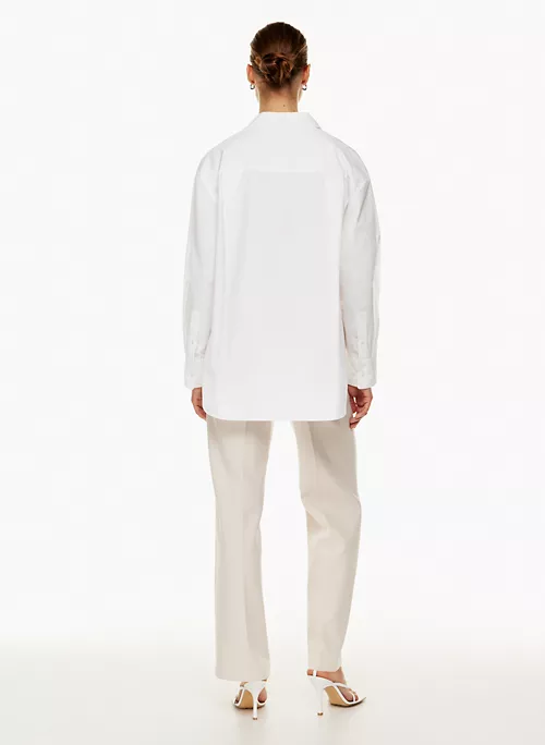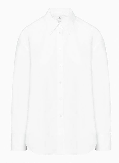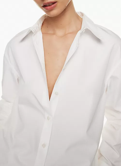 This is a long-sleeve button-up shirt with a adjustable button-closure cuffs and a rounded hem. It’s cut from refined Italian poplin with a smooth, crisp feel.