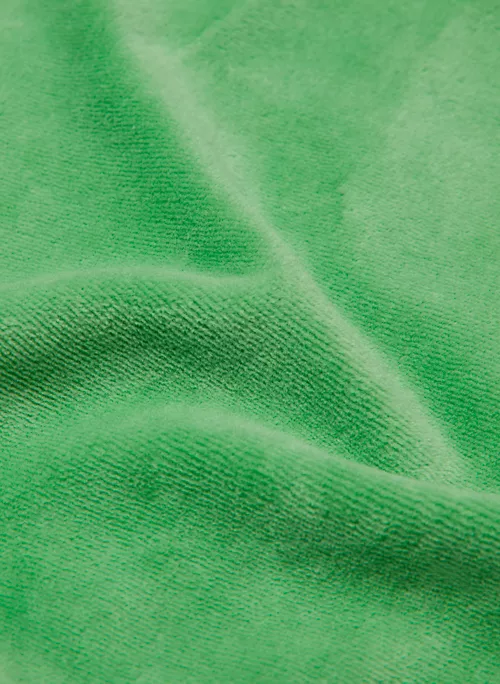 This is a shrunken, zip-up hoodie with a kanga pocket and a double-layer hood. It’s made from plush, matte velour made with a combination of organic cotton and recycled materials.