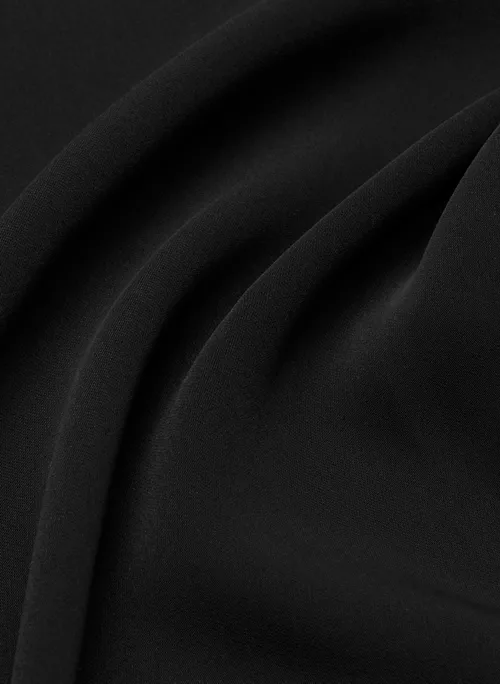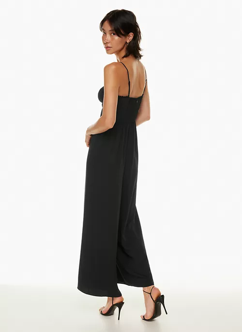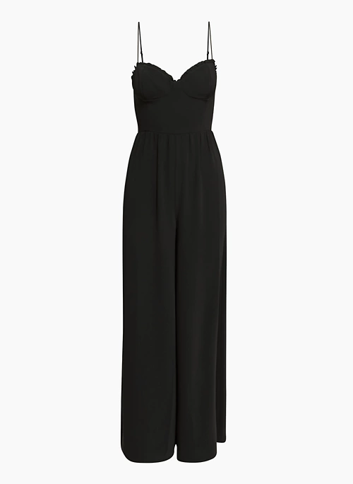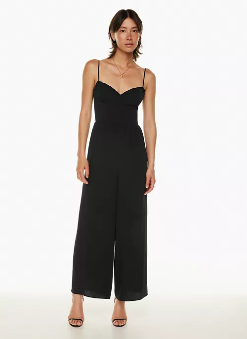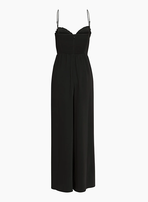 This is a bustier jumpsuit with a lined bodice, smocked back panel and sweetheart neckline with a ruffled trim. It’s cut from drapey, matte satin that’s made with recycled materials.