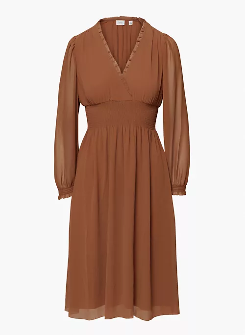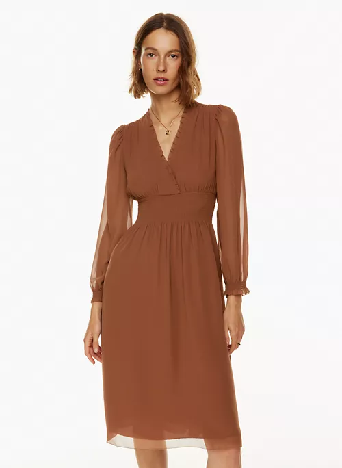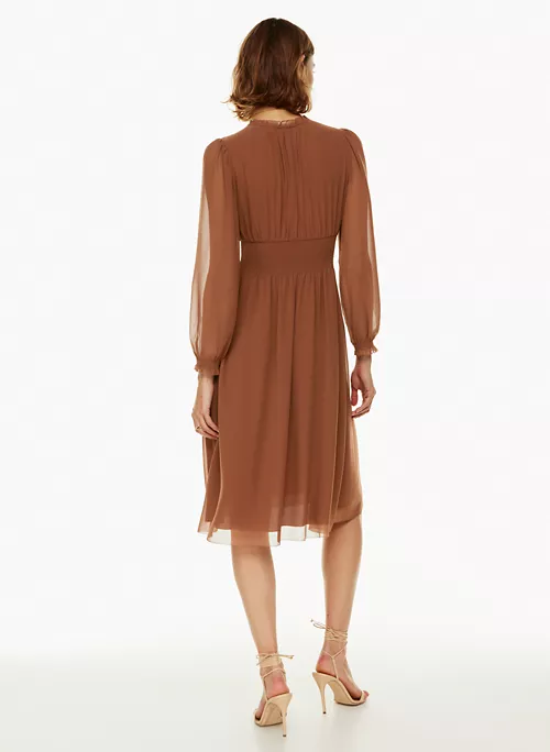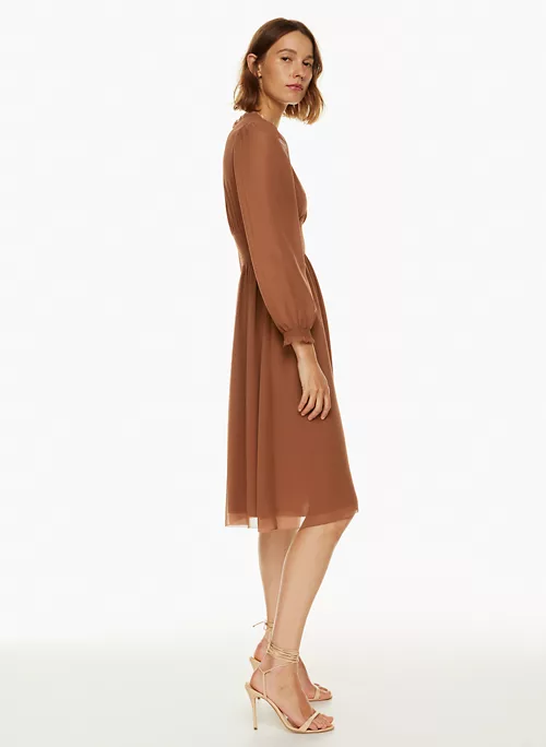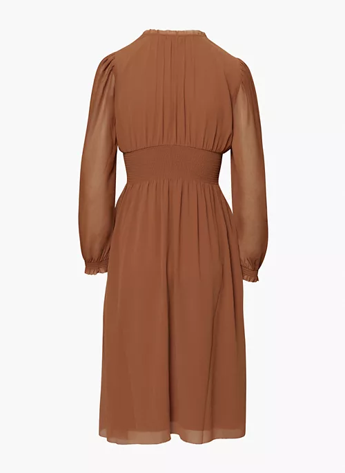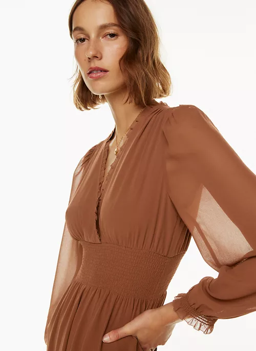 This is a puff-sleeve midi tea dress with sheer sleeves and a smocked waist. Itās made with FĆŖte Chiffon ā lightweight, semi-sheer fabric with an ethereal drape thatās made from 100% recycled materials.Ā