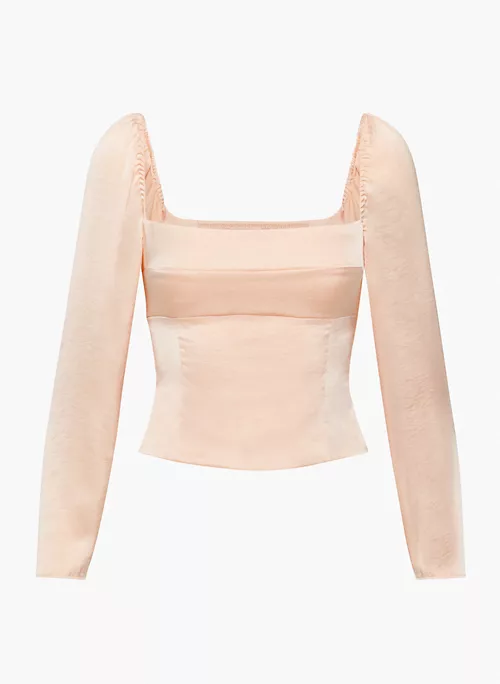 This is a bustier blouse with a smocked back panel. It’s made from Effortless Satin™ — drapey, lightweight Japanese satin with a glossy look and feel.
