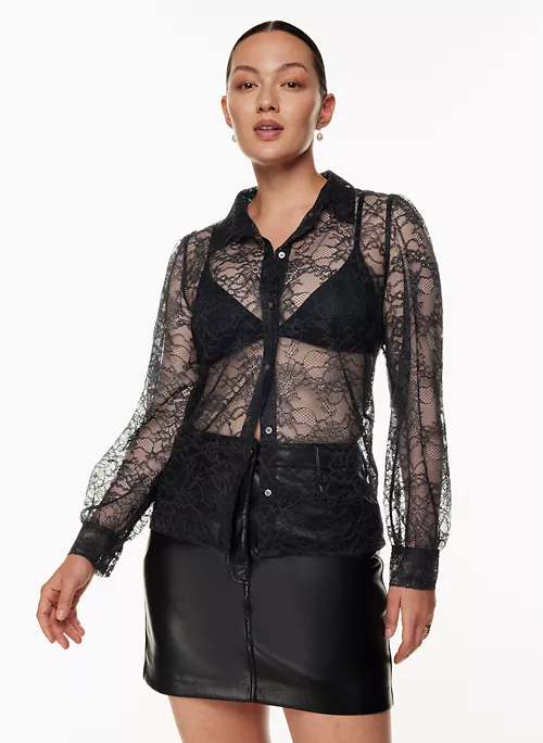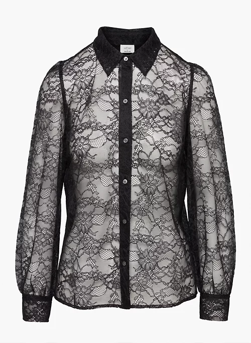 This is a long-sleeve button-up blouse with a relaxed fit. It’s made from lightweight floral lace.
