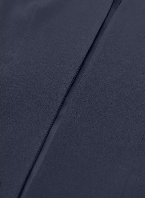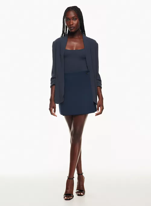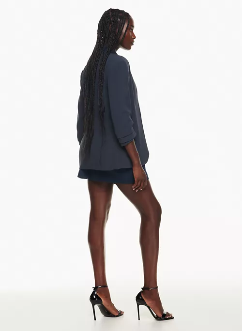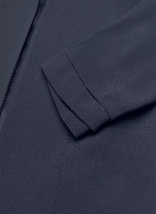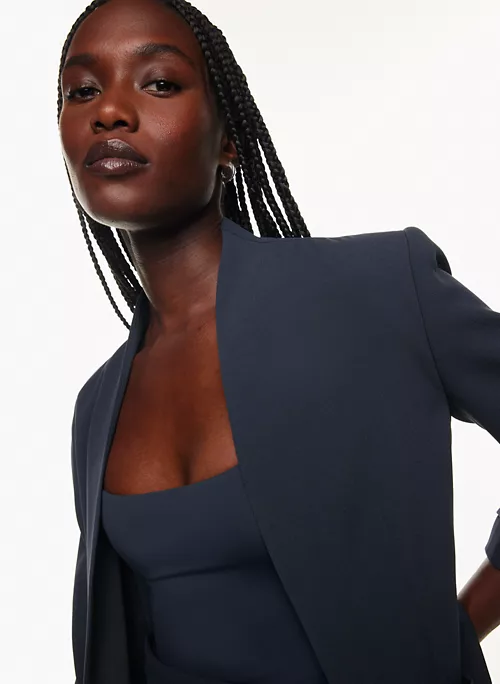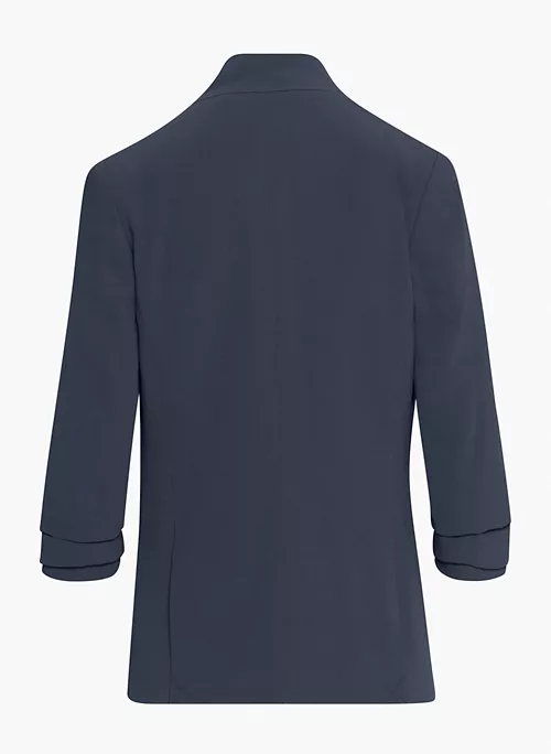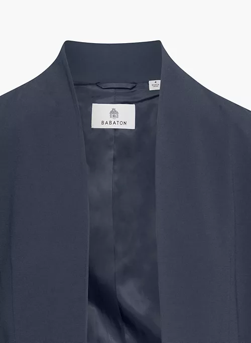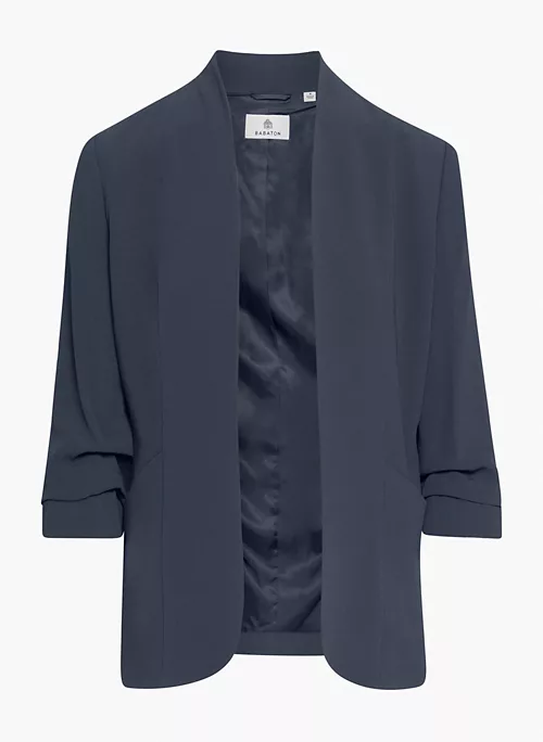 This is an open-front blazer with side drop pockets, ruched sleeves and shoulder pads. It’s cut from Mirror Crepe — Babaton’s essential crepe fabric with a soft drape and silky satin back. It’s sourced from an innovative Japanese mill and made with wood-based fibres from responsibly managed forests with a focus on protecting ecosystems and providing social benefits for local communities.