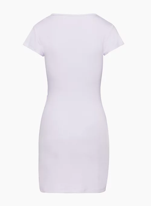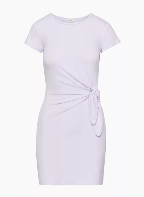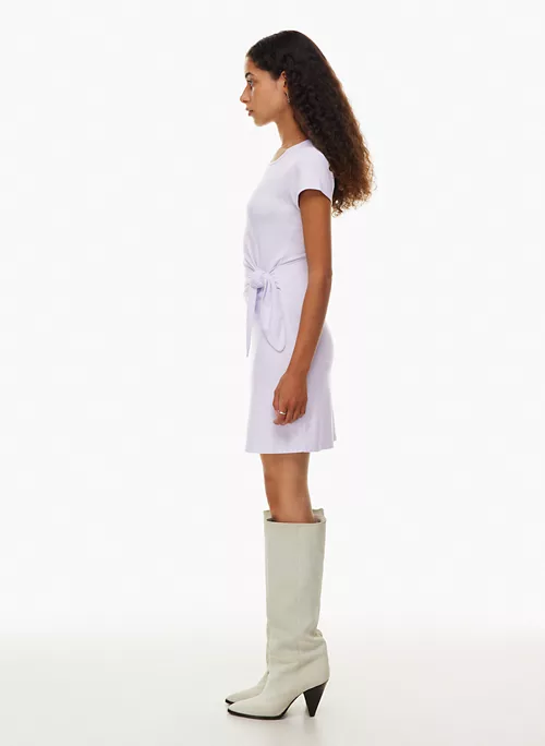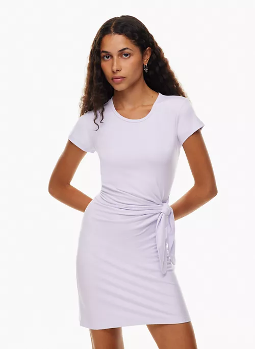 This is a crew-neck t-shirt dress with a tie detail and side slits. It’s made with Relux Jersey, an ultra-soft and drapey fabric that uses LENZING™ ECOVERO™ Viscose — responsibly sourced wood-based fibres produced through a process that reduces impact on forests, biodiversity and water supply.