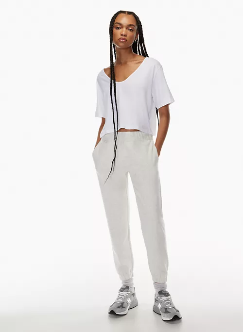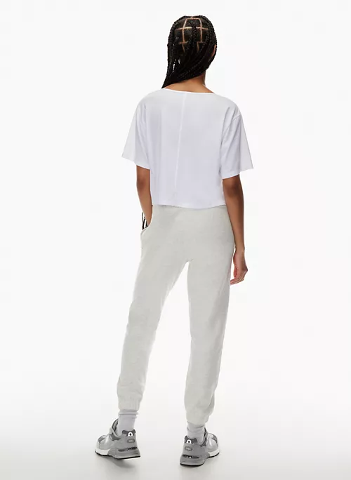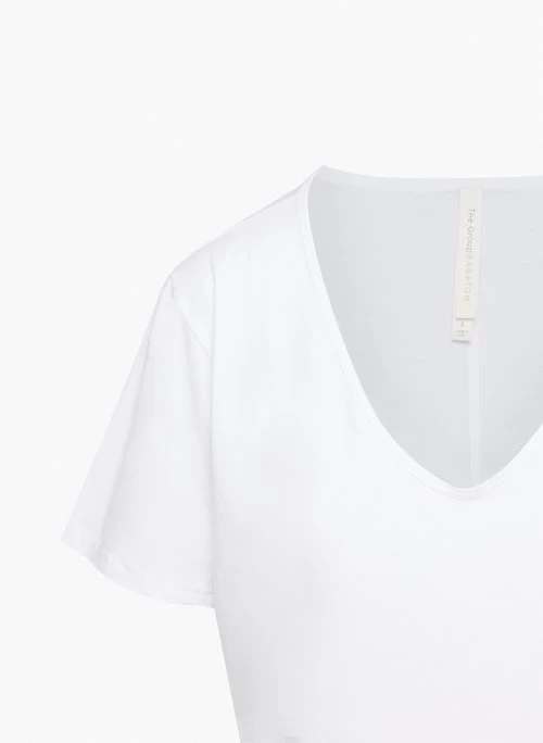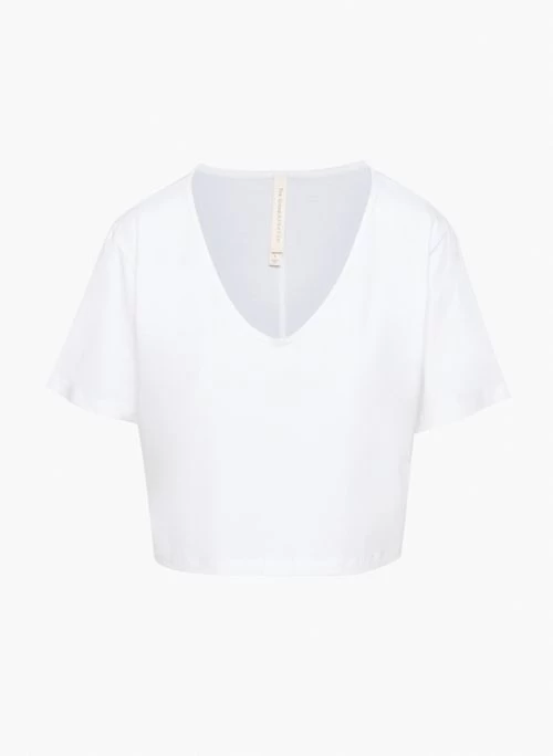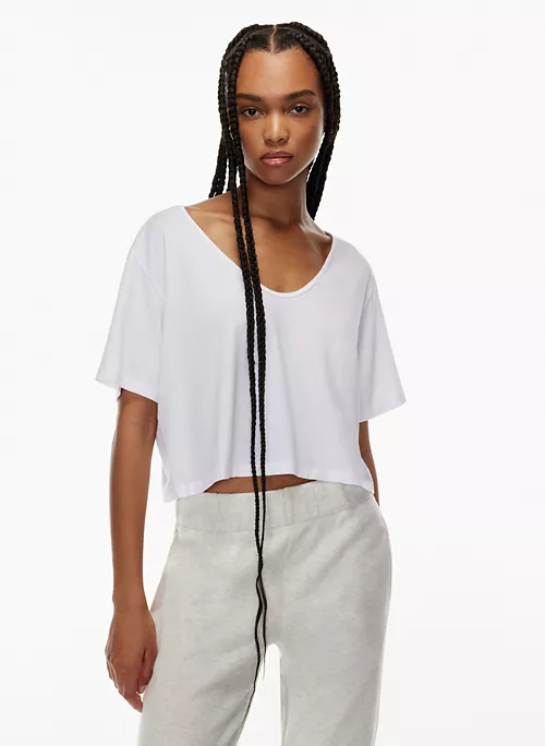 Like, really soft. This is the cropped version of our Foundation V-Neck T-Shirt. It’s made with exceptionally soft Peruvian Pima cotton and TENCEL™ Modal — responsibly sourced wood-based fibres produced through a process that reduces impact on forests, biodiversity and water supply.