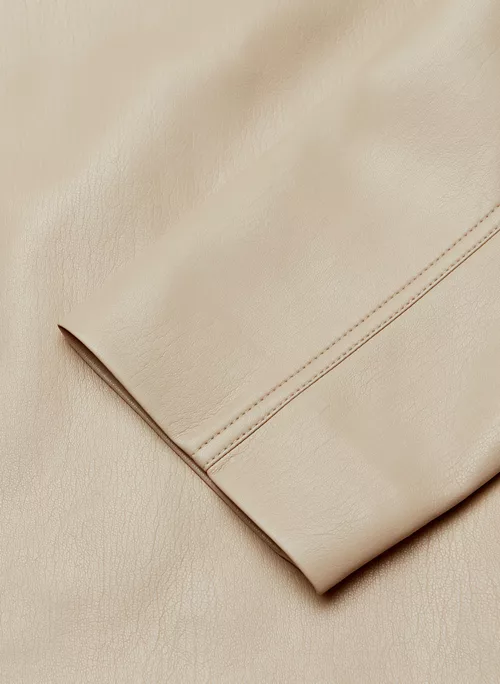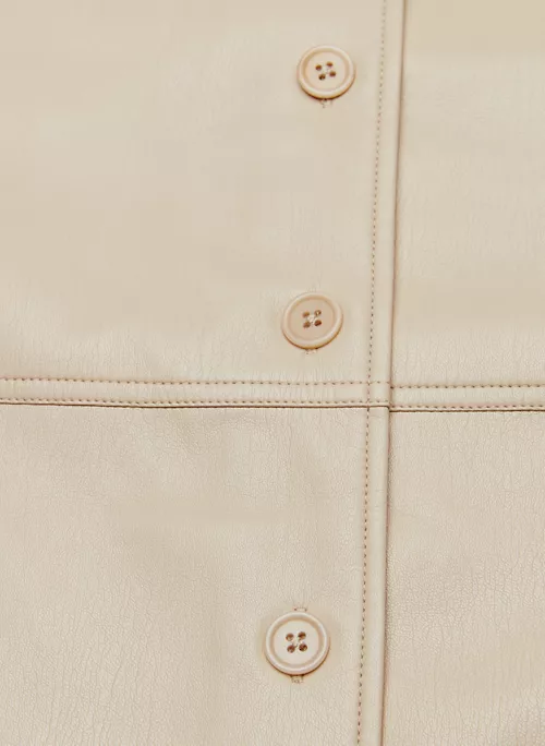 This is a button-up shirt jacket with inseam pockets and topstitch detailing throughout. It’s made with our innovative Vegan Leather that looks and feels like the real thing.