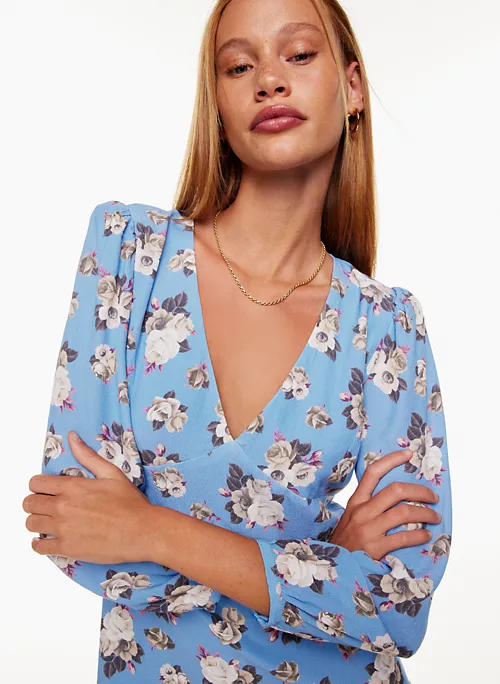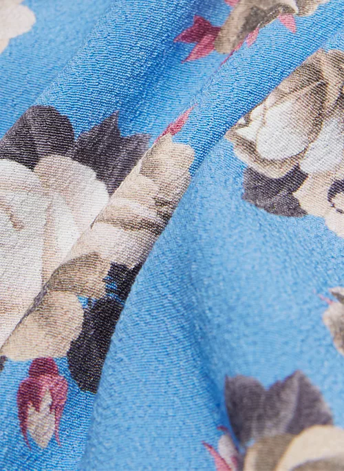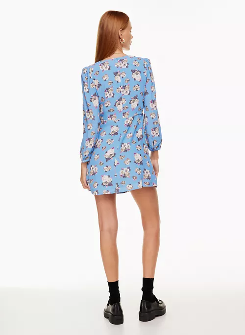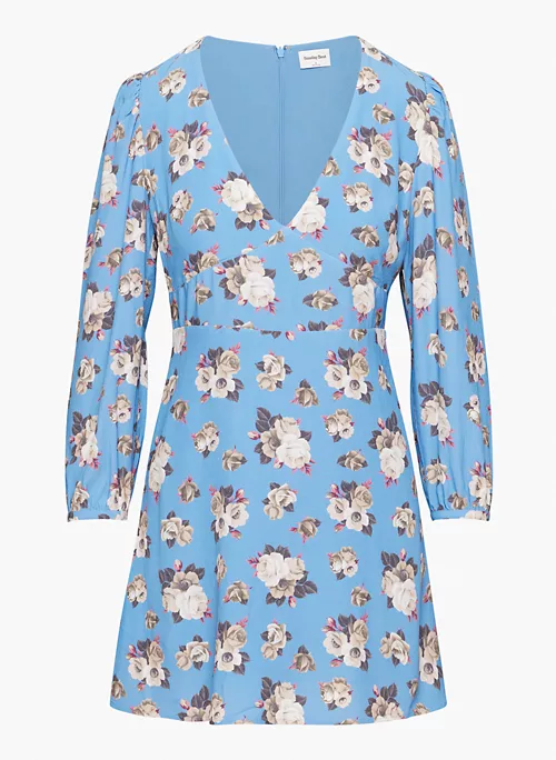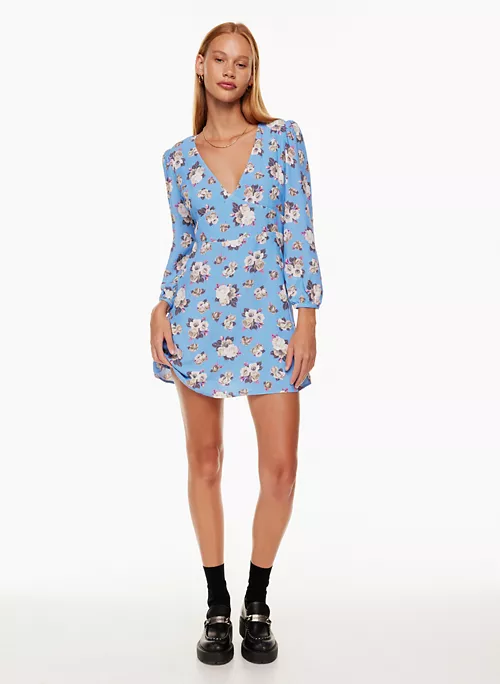 This is a V-neck mini dress with a lined bodice and skirt. It’s cut from drapey crepe fabric with a subtle pebbled texture. This version comes in an exclusive floral print that was designed in-house.
