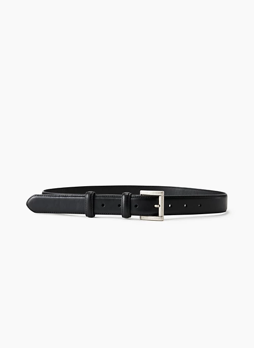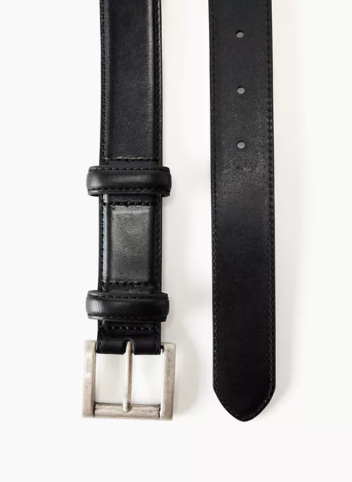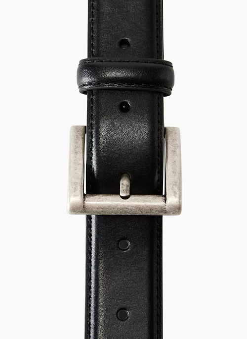 This is a classic belt with a square buckle. It’s made with 100% genuine leather and finished with a solid brass buckle.